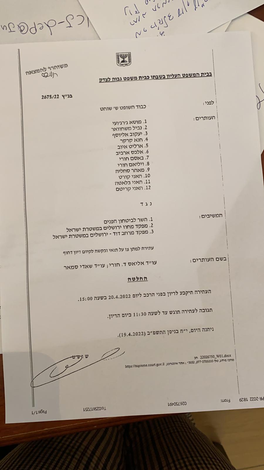 اهلا قدمت شخصيات ومؤسسات مقدسية أرثوذكسية التماسا الى المحكمة العليا ضد قرار شرطة الاحتلال تقييد وصول المسيحيين الى كنيسة القيامة وتقليص عدد المحتفلين بسبت النور عشية أحد القيامة بما ينافى مع أبسط حقوق الإنسان وحرية العبادة والحقوق المتوارثة - الستاتيكو - والمواثيق الدولية. كما تم رفض اقتراح تسوية يقضي بعدم منع الدخول الى البلدة القديمة عبر الحواجز و بالسماح ل٤٠٠٠ شخص فقط بالوصول الى كنيسة القيامة ومحيطها مع إعطاء الشرطة الحق بإغلاق الحواجز اذا ارتأت ذلك. وقد تمسك المدعين بحقوقهم الاساسية في ممارسة شعائرهم الدينية وحرية الوصول الى اماكن العبادة والاحتفالات التقليدية في حارة النصارى. المؤسسات العربية الارثوذكسية في القدس