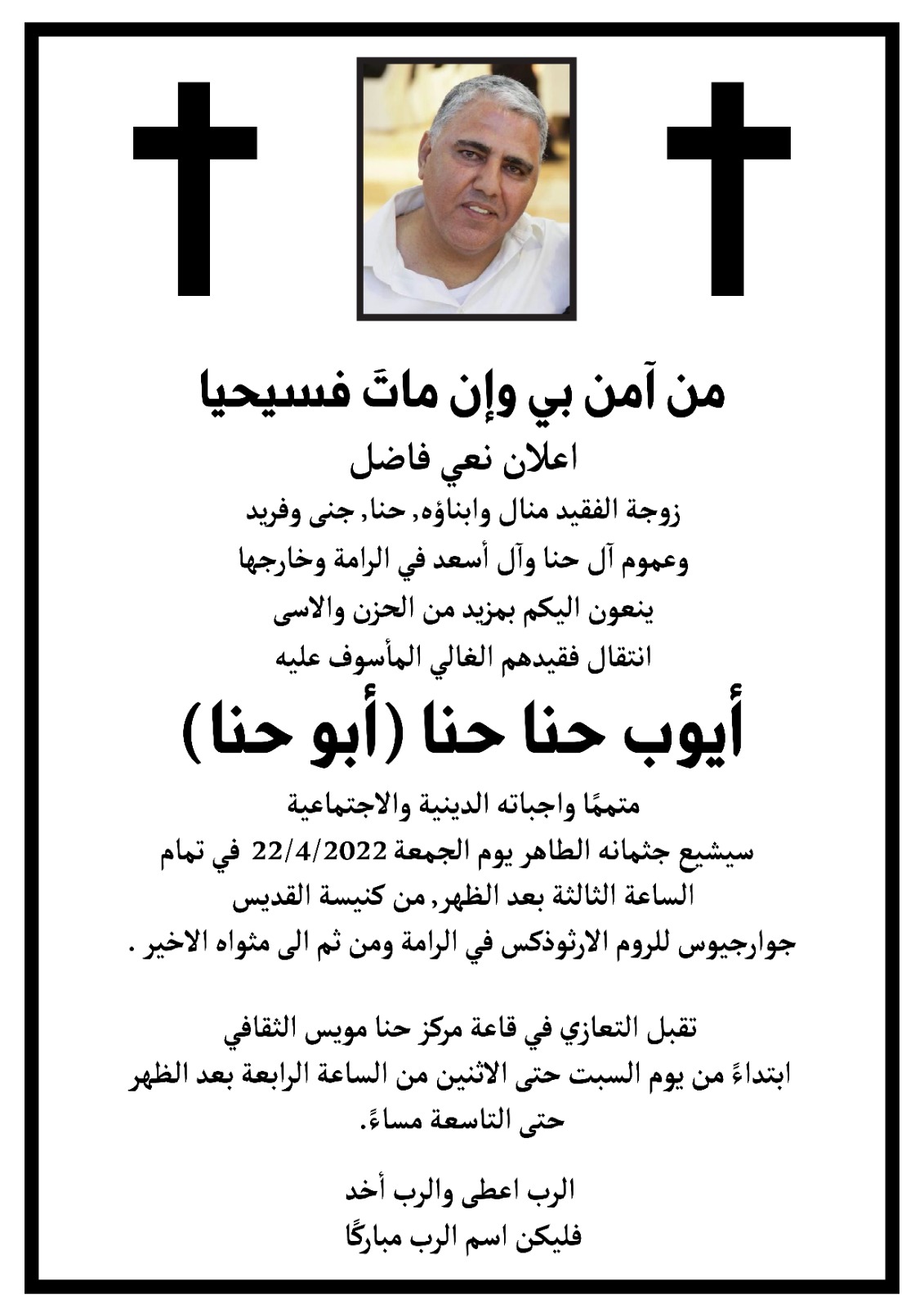 الرامة: وفاة الفاضل ايوب حنا حنا ابوحنا