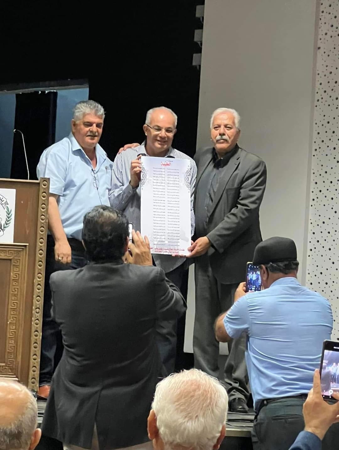 وبعد فاصل عزف للفناّن أبو خيط استأنفت صيرفي الجولة الأخيرة، فألقى الطّفل الموهوب عمري مصاروة قصيدة حكاية بائع الزعتر، وتلاه مصطفى أمارة قصيدة ويسألوني من أنا، يوسف أبو خيط قصيدة قلمي من شعري إلى حتفي، واختتم الأمسية الشّعريّة الأديب د. أسامة مصاروة بقصيدة مدينة الضّباب، وقام بعدها أعضاء الاتّحاد بتسليمه درعًا رمزيًّا تقديرًا لجهوده في إنجاح هذا النّشاط الكبير والمميّز. وبغناء جماعيّ شارك فيه الحضور أنشدوا مع إغلاق الاحتفال نشيد "موطني".