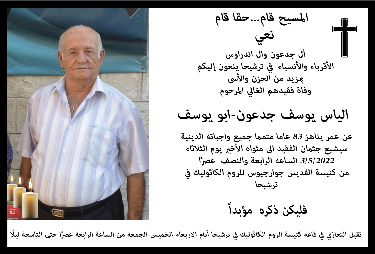 ترشيحا: وفاة الفاضل الياس يوسف جدعون - ابو يوسف