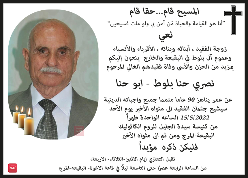 البقيعه: وفاة الفاضل نصري حنا بلوط-ابو حنا