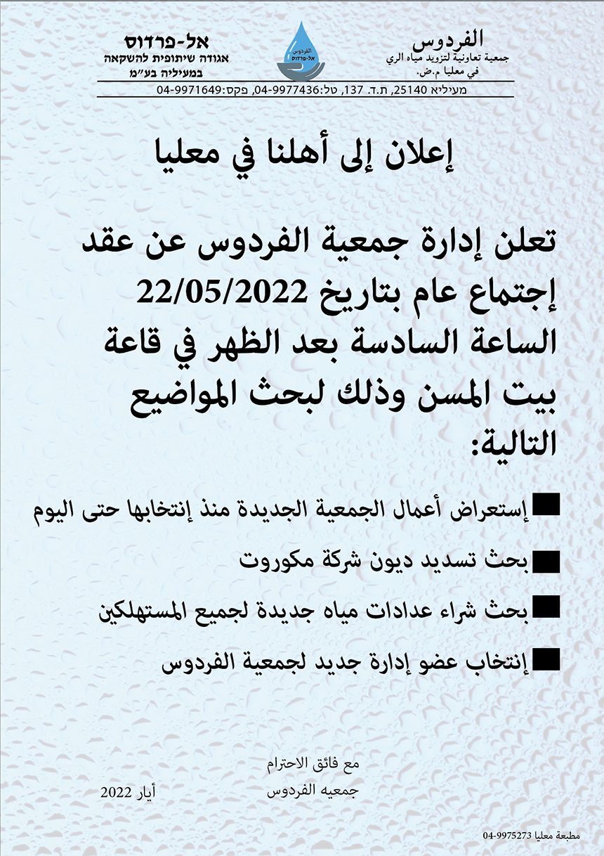 معليا: جمعية الفردوس في اعلان عن اجتماع عام