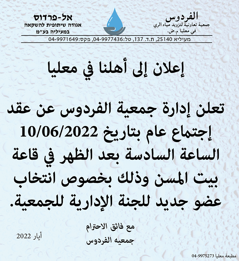معليا : جمعية الفردوس تدعو الى اجتماع عام