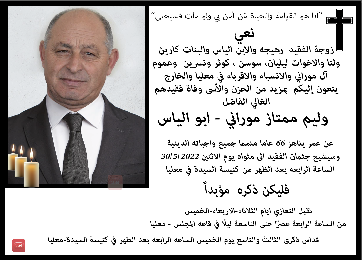 معليا: وفاة الفاضل وليم ممتاز موراني ابو الياس