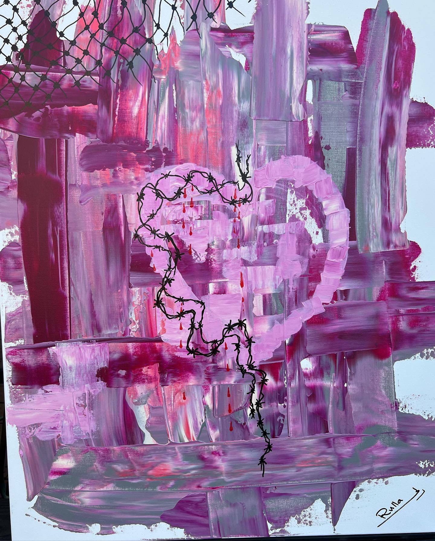 عن لوحة "الحب الفلسطيني" تقول رلى: القلب الفلسطيني قلب مكسور نصفه مفعم بالحب والنور. والنصف الآخر ينزف ويتألم.