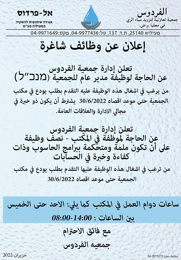 معليا: جمعية الفردوس تعلن عن وظائف شاغرة