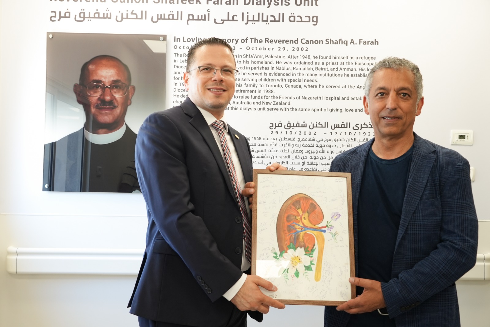 بدأت القصة قبل 4 سنوات تقريبًا، حين تواصل السيد نجيب فرح مع المستشفى بهدف التعرف ورغبته بدعم المشاريع المستقبلية، إتصالات قصيرة، زيارات قصيرة، قرارات جريئة، حتى بات واحد من أكثر الداعمين تشجيعًا لعمل المستشفى. من كندا حتى الناصرة، أتى المغترب السيد نجيب فرح، حاملا معه الفرح، الدعم السخي والمحبة لوطنه ولأهله، والتي ترسخت فيه منذ نعومة أظافره من والديه، وقرر أن يدعم تجديد وتوسيع قسم غسيل الكلى في المستشفى استمرارًا لمسيرة عطاء والده القس الكنن شفيق فرح للمؤسسة.