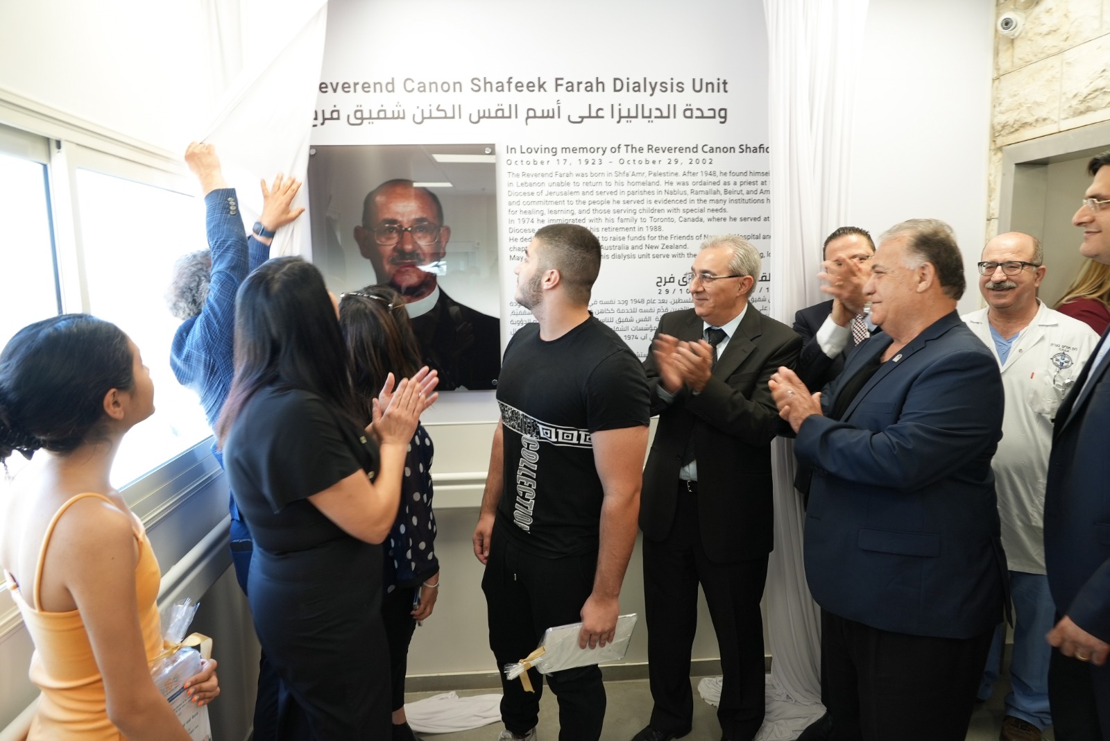 بنهاية الحفل، توجهت إدارة وطاقم المستشفى، عائلة فرح والحضور الكريم، إلى قسم الدياليزا، لرفع الستار عن لافتة تدشين القسم باسم القس الكنن شفيق فرح، وبعدها قاموا بجولة في القسم لإلقاء التحية على المرضى، ورؤية ثمار العمل والتوسيع التي جرت في السنتين الأخيرتين.