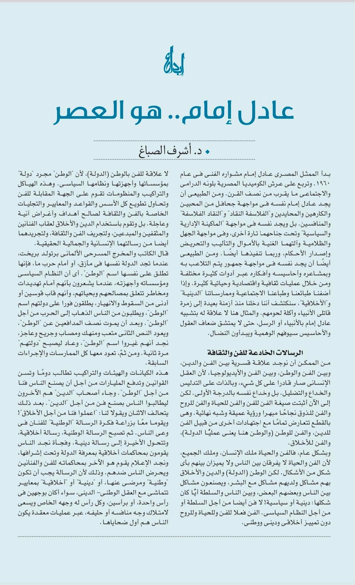 هذه مقاطع من رؤيتي للممثل المصري عادل إمام، نشرتها مجلة "إبداع" في عدد شهر يونيو 2022. وهي رؤية مجردة تماما، بعيدا عن الشخصنة وإعادة "المحاكمات". وبعيدا عن خلط الأمور إما عن مكر وخبث أو عن جهل واستسهال... وسيظل عادل إمام في الفن المصري "عصرا بأكمله" إلى أن يجد جديد. شكرا لمجلة إبداع في كل إصداراتها، وكل تجلياتها، وكل تطويراتها الجمالية والثقافية الجامعة، وخصوصا في إصدارها الأخير بفريق عملها الأكثر مرونة وتحررا وفهما وقربا من الواقع الاستثنائي الذي يفرِّخ لنا أجيالا من الكتاب والمثقفين مهما كانت هذه الاستثنائية الضاغطة بكل سلبياتها وإيجابياتها... كل سنة وعادل إمام بخير، وكل سنة وفريق إبداع بكل خير...