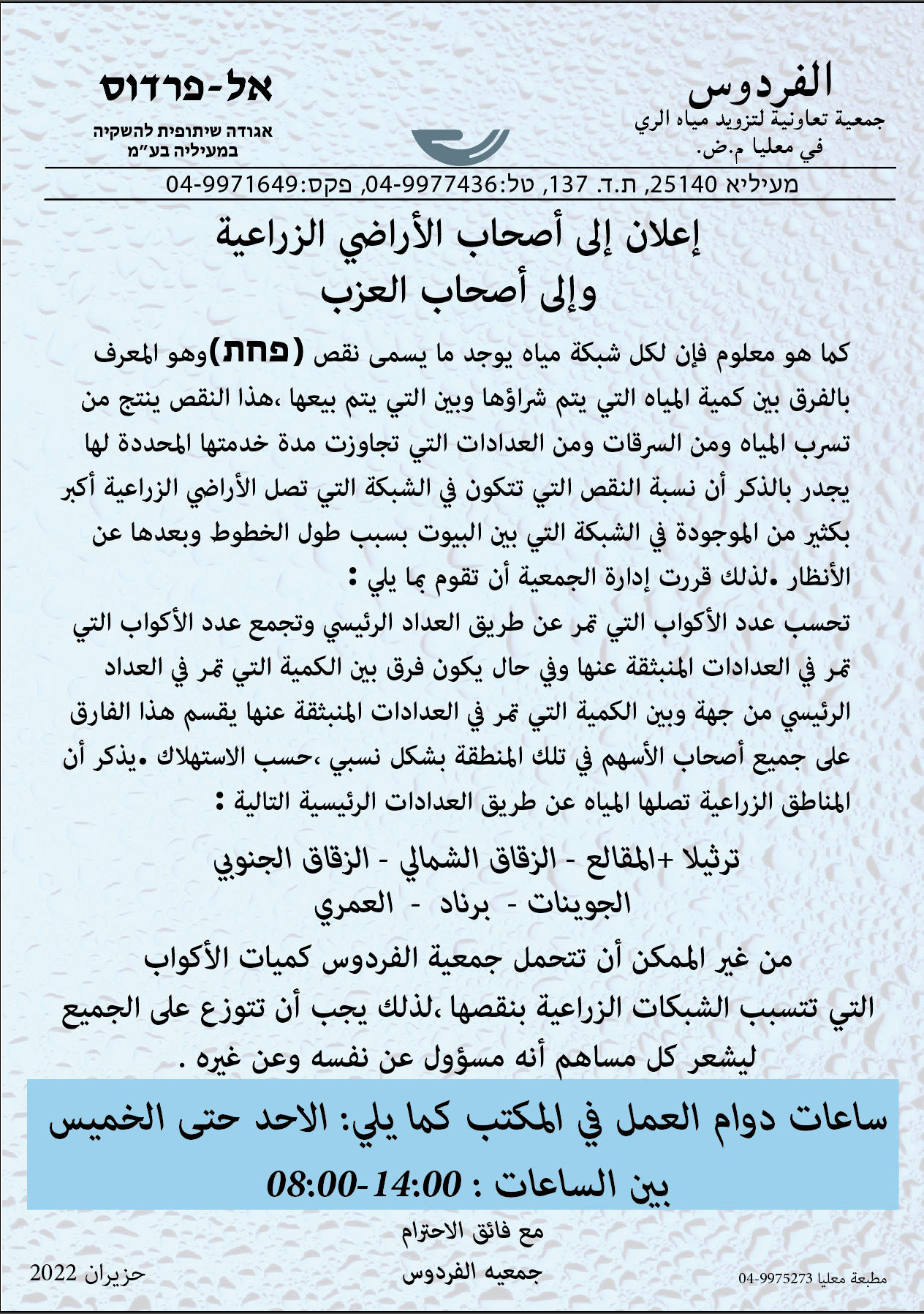 معليا: اعلان جمعية الفردوس لمياه الري والسقي