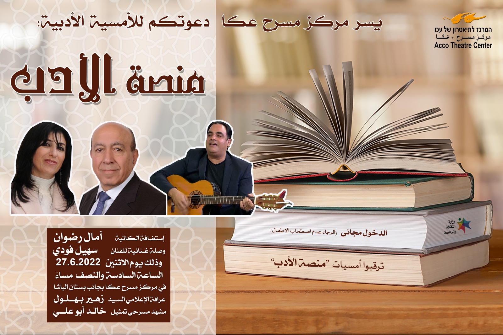 أقامتْ إدارةُ مسرح عكّا أمسيةً أدبيّةً للكاتبة آمال عوّاد رضوان، على منصّةِ مسرح عكّا الأدبيّة، وبين جدرانِ أزقّتِهِ وعُقودِهِ العتيقةِ وفضاءاتِهِ الأنيقةِ، وذلك بتاريخ 27.6.2022، ووسط حضورٍ من أدباء، وشعراء، وفنّانين، ونساء "النّادي النّسائيّ الأرثوذكسيّ عبلين"، ونساء "نادي نساء عكّيّات"، وقد أدار الأمسيةَ الإعلاميّ السّيّد زهير بهلول، في حوارٍ لبقٍ شيّقٍ ومُكثّفٍ، وفي جولةٍ سياحيّةٍ وامضةٍ كلمحِ البصر في حياة آمال عوّاد رضوان، تناول عدّةَ مَحاورَ حول نشأة الكاتبة آمال الأدبيّةِ والفنّيّةِ والرّوحيّةِ، وتساءلَ حولَ إصداراتِها الأدبيّةِ في شتّى الأجناس الأدبيّةِ الّتي تخوضُ كتابتها من: مقالةٍ، ونقدٍ أدبيّ، وشعرٍ في قصيدةِ نثر، وحواراتٍ، وتقاريرَ أدبيّةٍ في المشهد الثقافيّ المَحلّيّ، والكتب التّراثيّة، والقصّةِ مُؤخّرًا، وتناولَ مواضيعَ أخرى حولَ الأدبِ الشّعبويّ والنّخبويّ، وحولَ أهمّيّة الشّهرةِ وجدوى الانتشار.