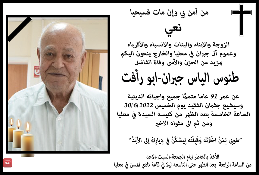 معليا: وفاة الفاضل طنوس الياس جبران ابو رأفت