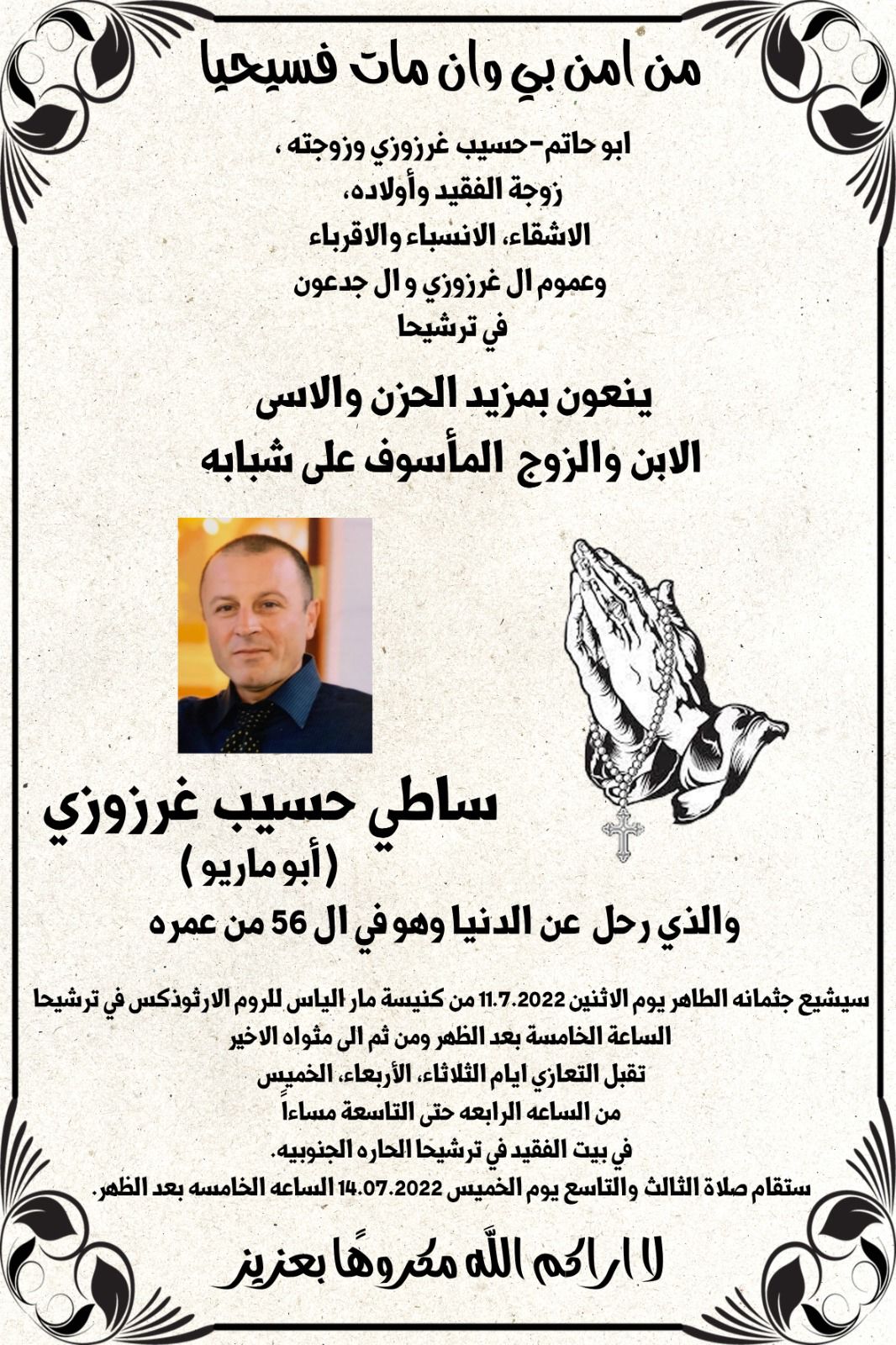 ترشيحا : وفاة الشاب ساطي حسيب غرزوزي ٥٦ عام
