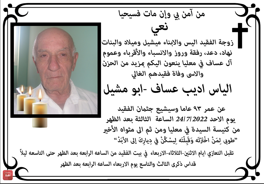 معليا- وفاة الفاضل الياس اديب عساف ابو مشيل