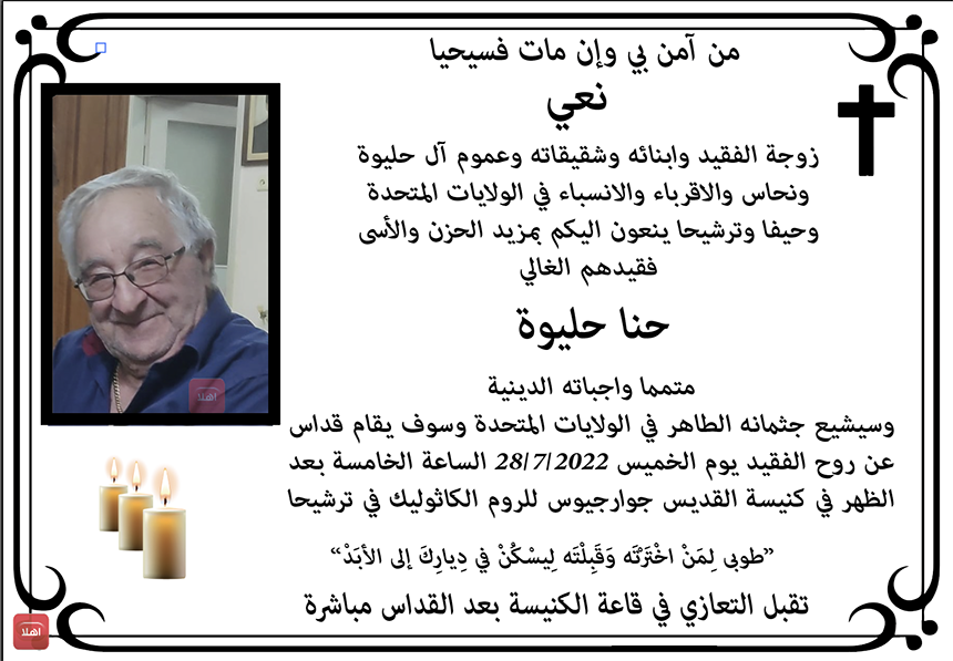 ترشيحا: وفاة الفاضل حنا حليوة في الولايات المتحدة الامريكية