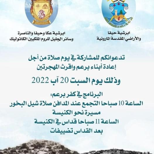 اصدرت ابرشية الموارنة في الارض المقدسة وابرشية الروم الكاثوليك في الجليل دعوة مشتركة لجميع الناس، وخاصة للمؤمنين، للمشاركة في مسيرة وصلاة اللتان ستنظما صباح يوم السبت الموافق 20 آب 2022 في كفر برعم المهجرة.