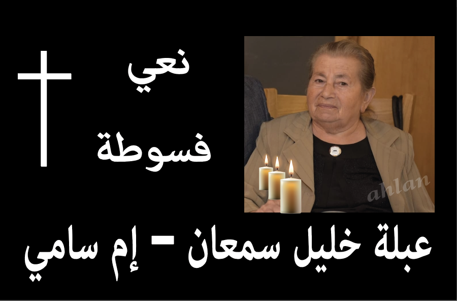 أنا هو القيامة والحياة من آمن بي وان مات فسيحيا نعي أبناء الفقيدة سامي، سهيل، سلوى، سميرة وسهام وعموم آل سمعان وخوري والأنسباء والأقرباء في فسوطة والخارج ينعون اليكم الفاضلة طيبة الذكر عبلة خليل سمعان – إم سامي المنتقلة إلى جوار ربها عن عمر يناهز 87 عاماً متممة واجباتها الدينية والدنيوية سيشيع جثمانها الطاهر اليوم الثلاثاء الموافق 16.08.2022 الساعة الخامسة والنصف بعد الظهر من كنيسة مار الياس في فسوطة ومن ثم إلى مثواها الأخير تقبل التعازي بالمركز الراعوي فسوطة من يوم الأربعاء 17.8 وحتى يوم الجمعة 18.8 من الساعة الخامسة حتى الساعة التاسعة مساءً الرب أعطى والرب أخذ فليكن اسمه مباركاً