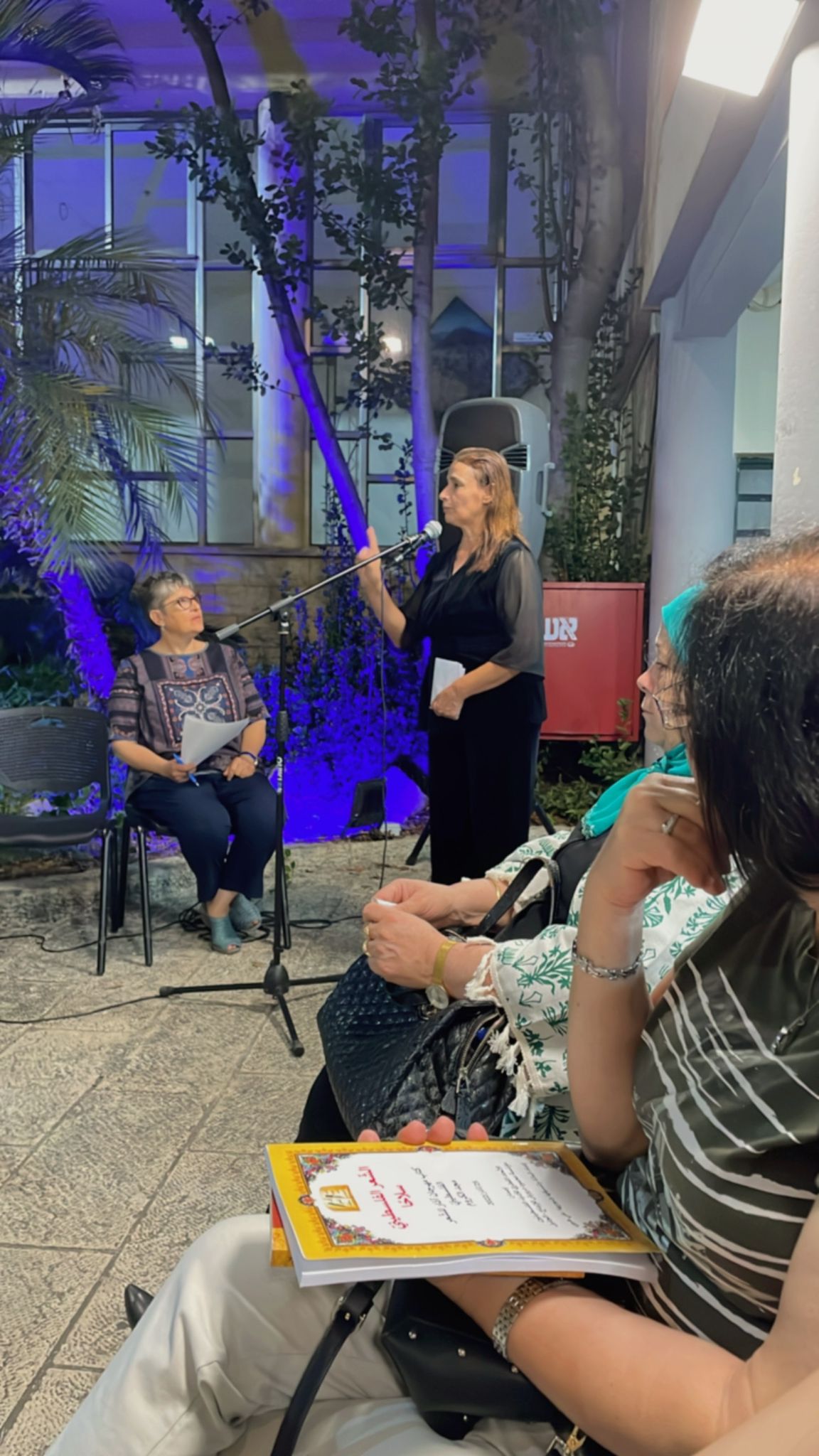 وفاجأت العريفة عُريب الجمهور بقراءة قطعة شعريّة من قصيدة للشّاعر علي هيبي ودعته إلى المنصّة لإلقاء قصيدة من ديوانه الجديد "ابن رشد يورق في الاحتراق" الّذي صدر مؤخّرًا، وقام بتوزيعه على الحضور. وقد قرأ مقاطع من قصيدة "صور مشتّتة تبحث عن قصيدة". وقبل كلمة المحتفى بها قدّمت المربّية إخلاص سليمان كلمة وتحيّة لابنة بلدها البعينة الفنّانة د. حجّة داعمة نشاطها المتنوّع ورسالتها الفنّيّة والتّربويّة.