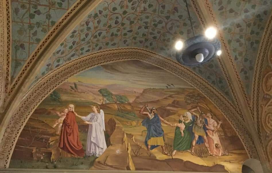 الجدارية التي في الكنيسة تروي القصة التى وردت في كتاب يعقوب من القرن الثاني ومفادها انه عندما امر هيرودس بقتل اطفال بيت لحم وتخومها، جاء الجند الى بلدة عين كارم في تخوم بيت لحم وارادوا قتل الصبي يوحنا المعمدان. فجاء الملاك واخذه من امه وخباه في جبال عين كارم.