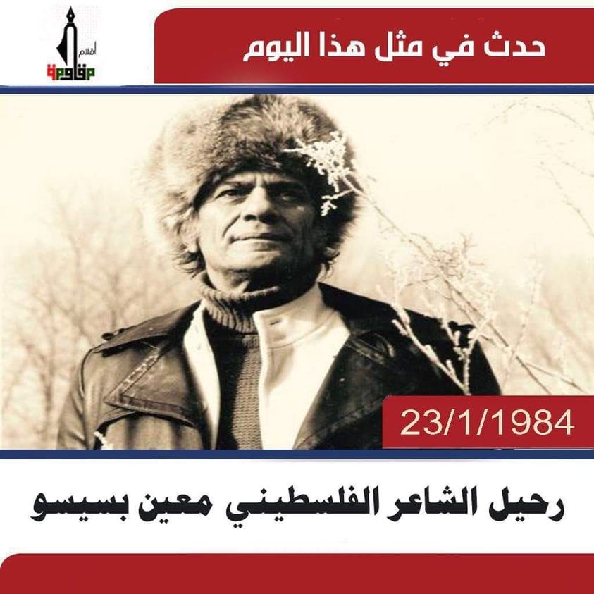 في الثالث والعشرين من كانون ثاني عام ١٩٨٤ رحل الشاعر المناضل معين بسيسو الذي ملأ الدنيا صخباً ثورياً بقصائده الحماسية الهادفة، رحل في لندن إثر نوبة قلبية حادة فاجأته خلال زيارة عمل للمملكة المتحدة، هناك بعيداً بعيد توقف ذلك القلب الكبير عن الخفقان، توقف صوت الشاعر الأممي الذي ملأ الدنيا بكتاباته في الشعر، والمسرح، والأدب والسياسة دفاعاً عن الشعب والثورة والأحرار في كل العالم، غاب معين بسيسو وبقيت كلماته وأشعاره حاضرة تشكل نبراساً هادياً لكل الذين ما زالوا قابضين على الجمر يصرون على حمل الراية والانحياز للعمال والكادحين والفقراء وكل المناضلين من أجل الحرية والديمقراطية والعدالة الاجتماعية.