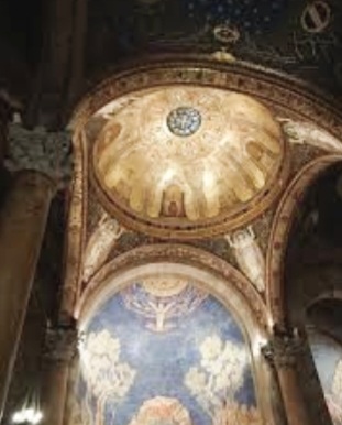 ولوحة الفسيفساء محمولة على أربعة أعمدة، يحمل كلّ منها احد الإنجيليّين، وكلّ عمود مؤلّف من اربعة أعمدة متلاصقة بشكل صليب، بين الأعمدة ثلاث قناطر ترمز للثالوث الأقدس.