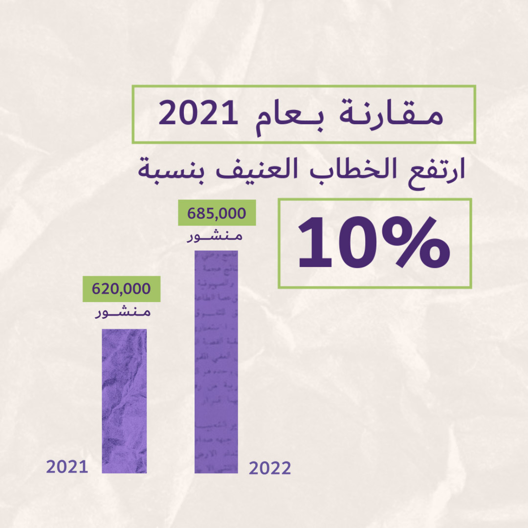 اهلا: حملة - المركز العربيّ لتطوير الإعلام الاجتماعيّ نتائج مؤشر العنصرية والتحريض في المحادثات العامة المنشورة باللغة العبرية على الانترنت خلال العام 2022. شهد العام 2022 ازدياداً ملحوظاً بحجم الخطاب العنيف تجاه الجمهور العربيّ والفلسطيني، حيث ارتفع الخطاب العنيف بما نسبته %10 مقارنة بعام 2021، ووصل عدد المنشورات العنيفة المنشورة عبر الشبكات باللغة العبرية إلى 685 ألف محادثة، مقارنة ب 620 ألف منشور عنيف خلال العام 2021.