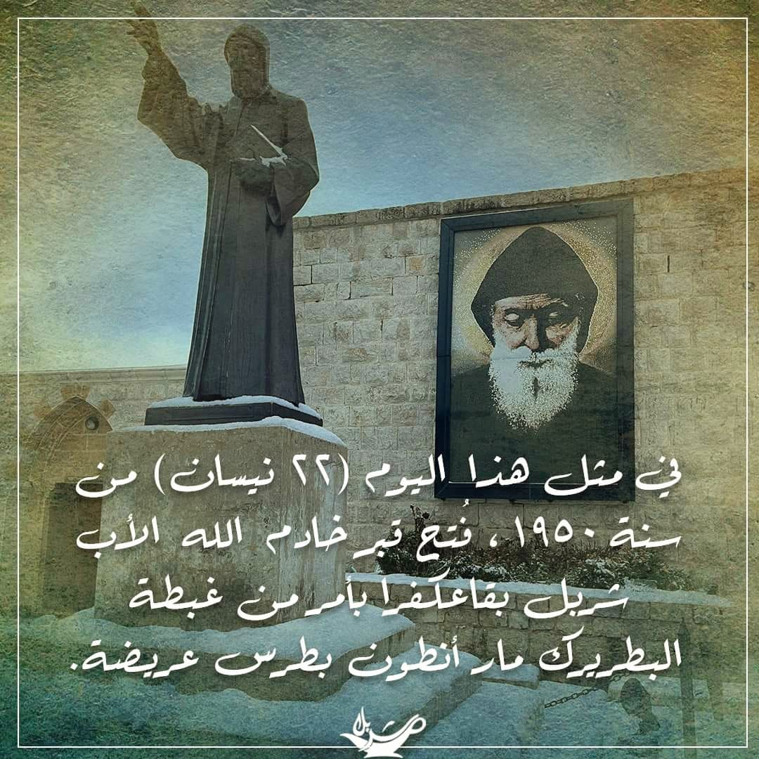 اهلا- شربل زوين في مثل هذا اليوم 22 نيسان/أبريل من سنة 1950، فُتح قبر خادم الله الأب شربل - بقاعكفرا بأمر من البطريرك مار أنطون بطرس عريضة، ووُجد الجثمان غير فاسد يَنضَح ويطوف على مادة لزجة من الدم والماء..