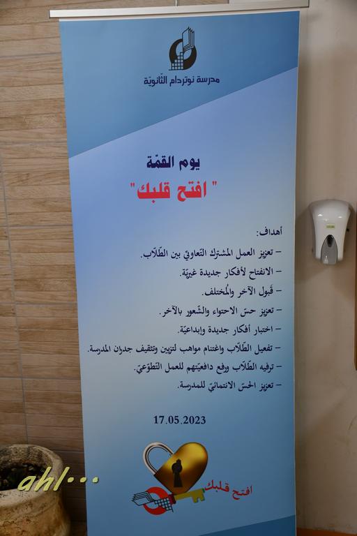 اليوم الأربعاء، يوم قمّة تحت عنوان " افتح قلبك " لطبقة الصّفوف العاشرة، تتويجًا لبرنامج خاصّ حول ظاهرة التّنمّر كان الطّلّاب قد شاركوا به ضمن البرنامج المدرسيّ الأشمل "دوكاتوس".