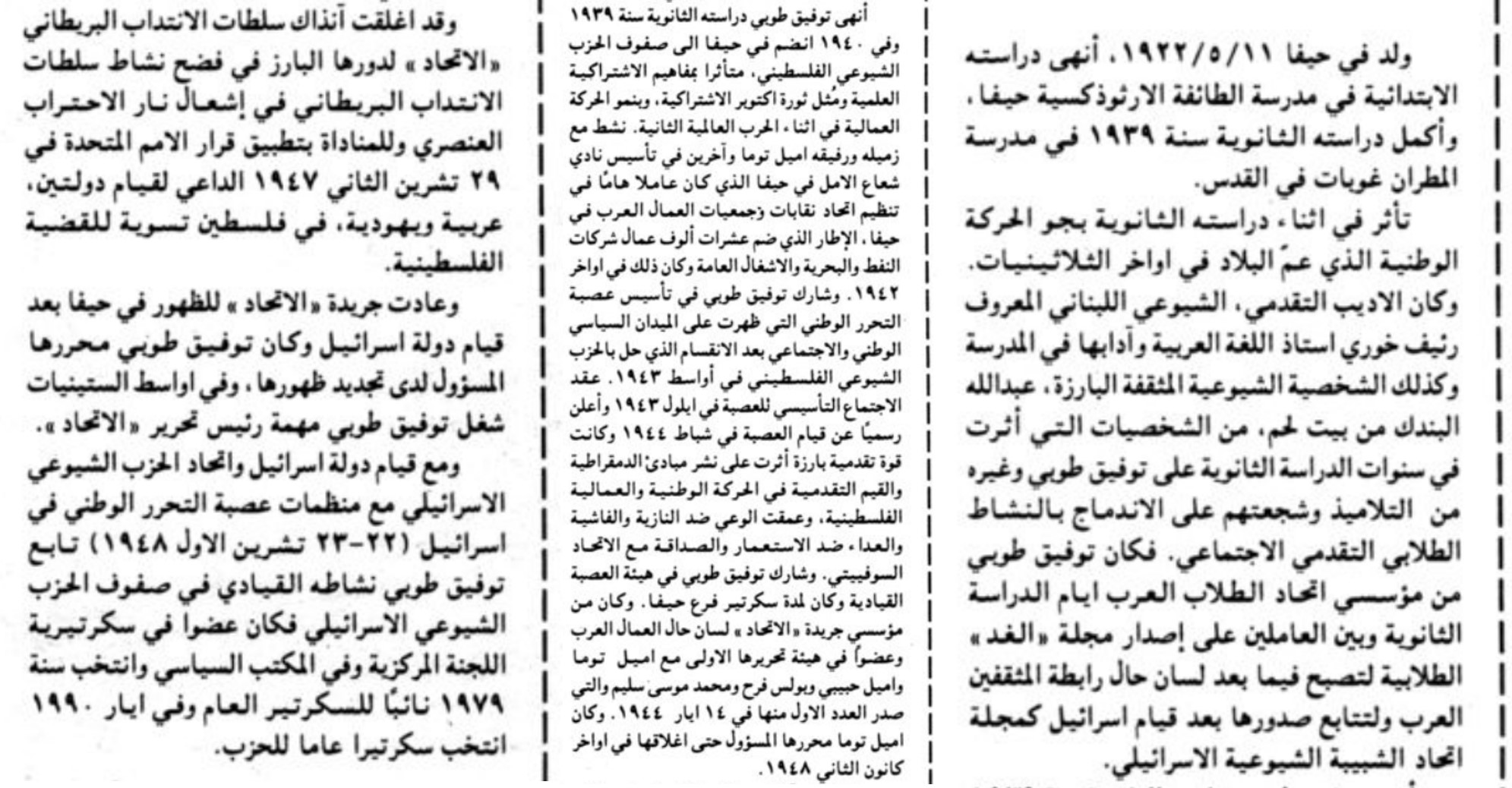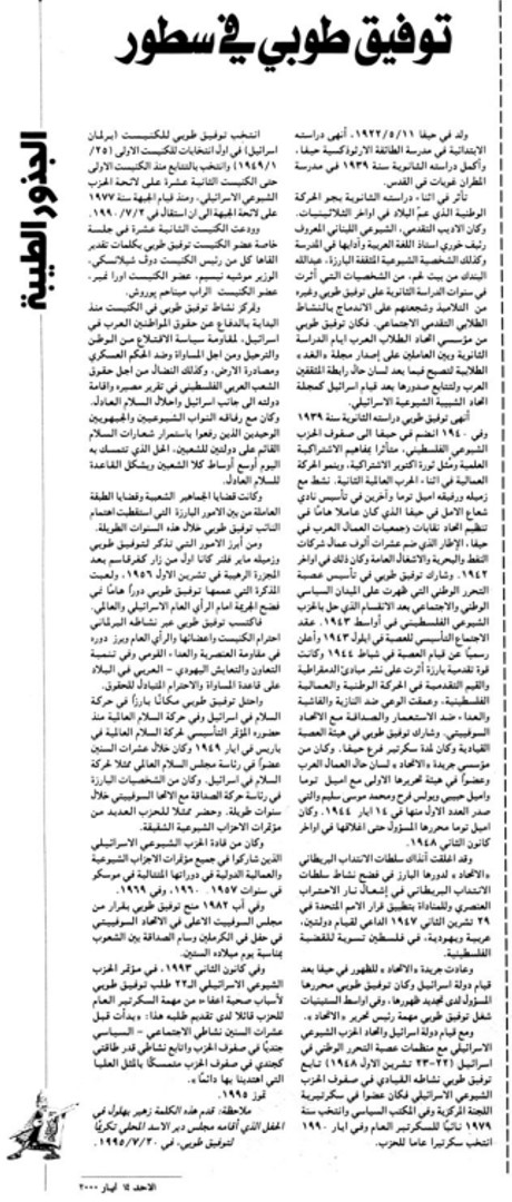 المجلس المحلي في دير الأسد يقوم بتكريم السياسي توفيق طوبي، وذلك يوم 20.7.1995، وقد قام الصحفي زهير بهلول بعرض مُلخص لسيرة حياته.