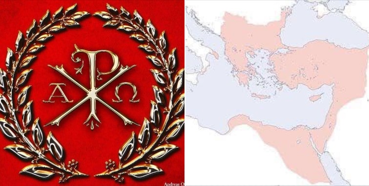 في الخريطة اللون البني: الإمبراطورية الرومانية الشرقية.