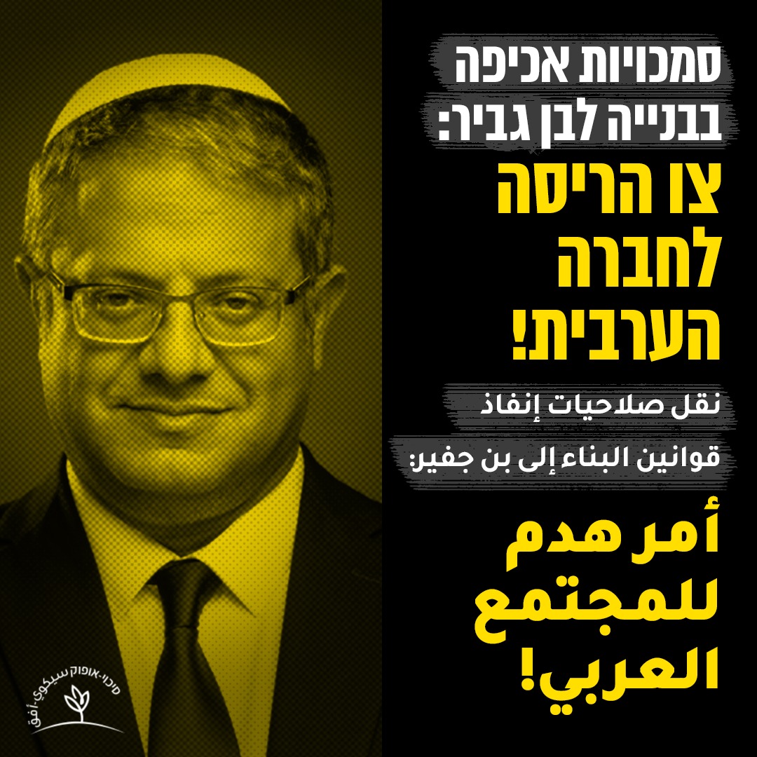 الحكومة تضع المزيد من الصلاحيّات المتعلّقة بأوامر الهدم الإداريّة بيدّ الوزير الأكثر عنصريّة وتطرّفًا.