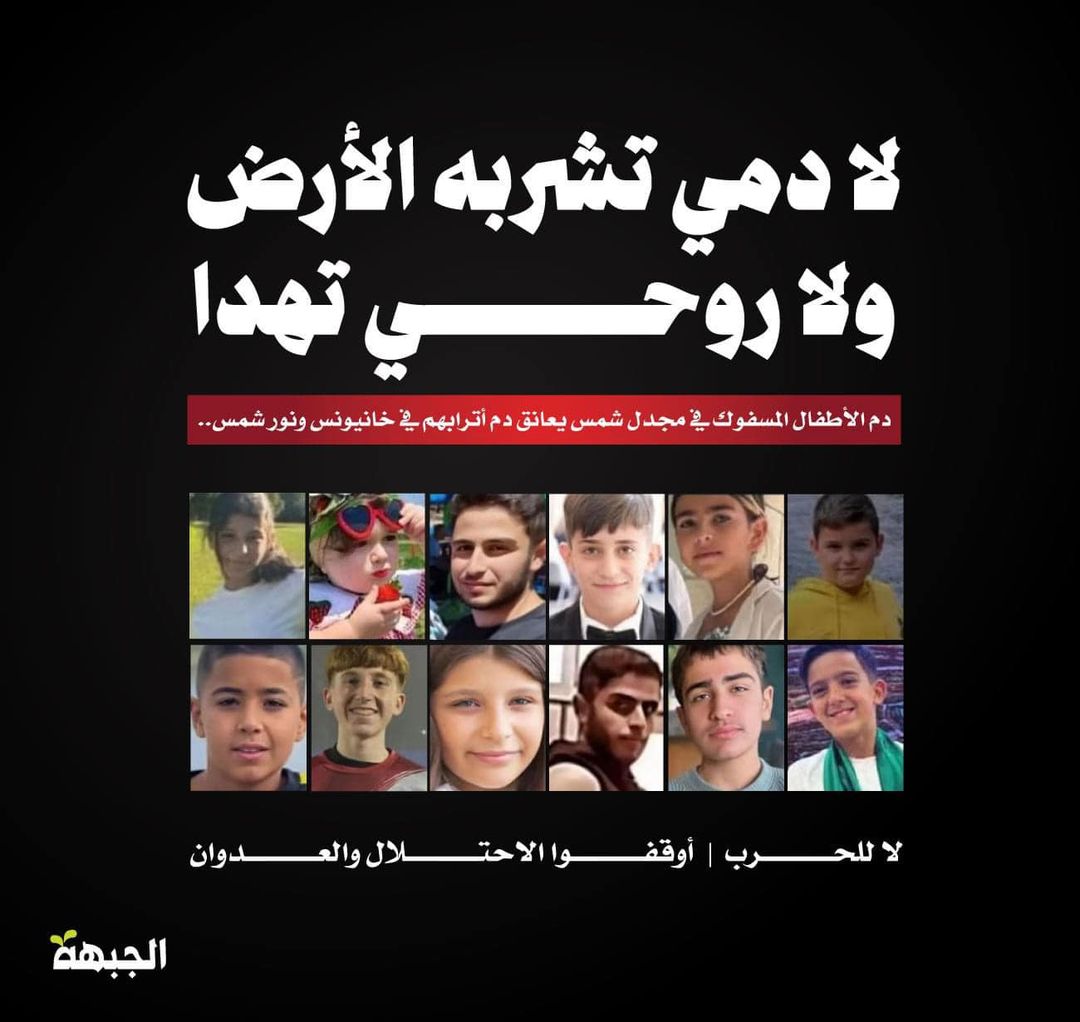 أصدر الحزب الشيوعي والجبهة الديمقراطية للسلام والمساواة بيان تعزية لعموم الأهل في الجولان السوري المحتل بعدما أدى انفجار قذيفة في قرية مجدل شمس إلى كارثة إنسانية راح ضحيتها 12 طفلا شهيدا وعدد من الجرحى.