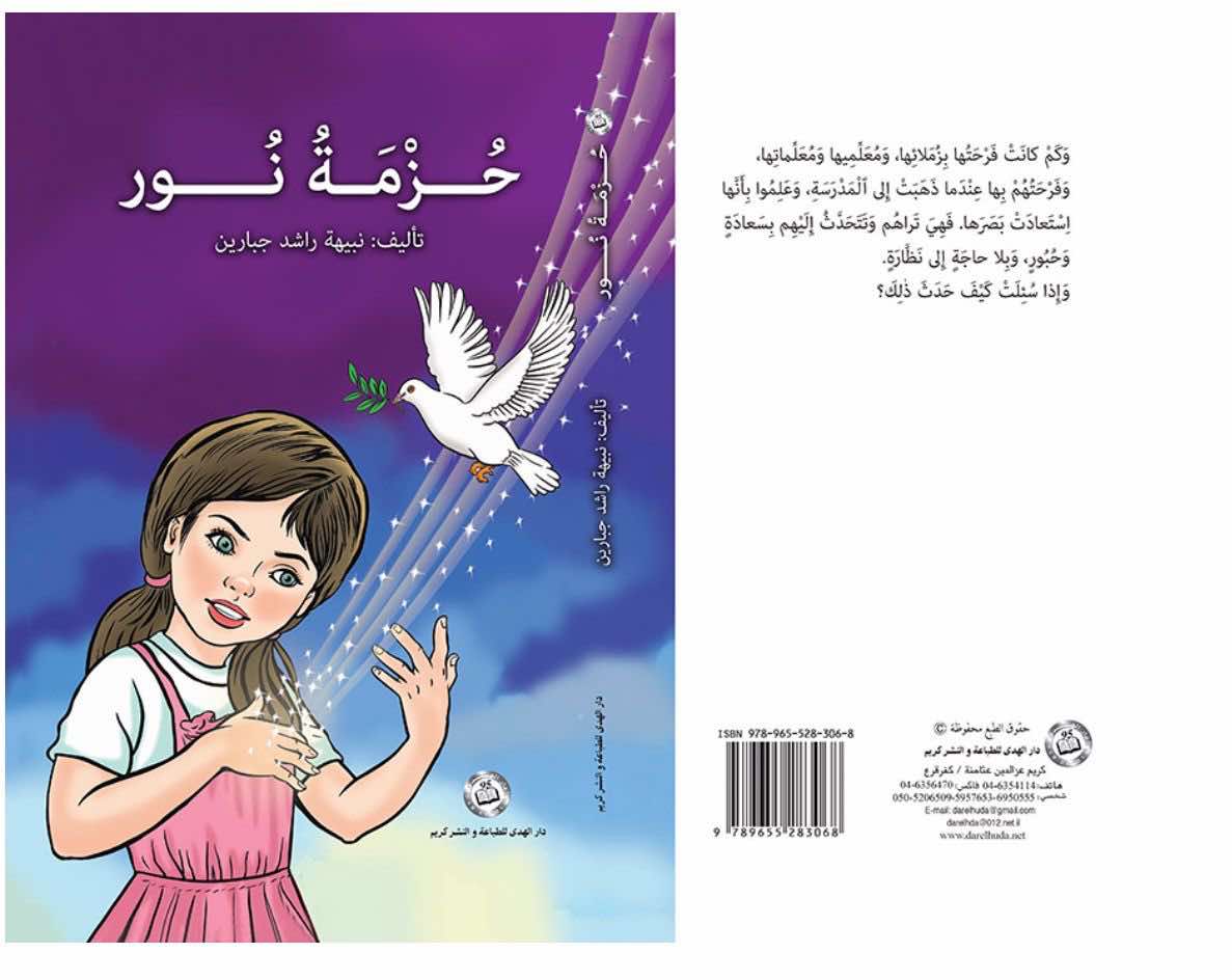 اهلا وأوّل طلب طلبته "نور من حزمة النّور هو أن تعيد لها" قوّة بصرها كما كانت قبل الاجتياح العسكريّ، وكان لها ما طلبت ممّا أدخل الفرحة إلى قلبها وقلوب والديها وإخوانها وزملائها وزميلاتها ومعلّميها ومعلّماتها وكلّ من يعرفونها. أمّا الطّلب الثّاني فكان أن تعيد حزمة النّور البصر لكلّ من فقد بصره أو ضعف بسبب الحرب، فتحقّق طلبها ودخلت الفرحة لقلوب الجميع دون أن يعرفوا سبب ذلك. والطّلب الثّالث كان شفاء قدَم زميلها" سالم" المصابة بسبب الحرب، فشفيت قدمه وعاد يلعب الكرة سعيدا مع أقرانه، والطّلب الثالث كان لشفاء زميلها "عادل الّذي يعاني من الإنطواء بسبب الحرب، وشفي عادل وعاد يلعب مع زملائه. وبما أنّ" نور" تحبّ الخير للجميع فقد طلبت من حزمة النّور أن تشفي جميع من يعانون من آثار الحرب مهما كانت معاناتهم. وإمعانا من"نور في حبّ الخير للبشريّة جمعاء فقد طلبت من حزمة النّور:" ليتك يا حزمتي الطّيّبة تدخلين القلوب، وتمحين منها شعور الحقد والكراهيّة والأنانيّة، وتملئينها بالحبّ والخير والطّمأنينة والتّسامح، فيسود السّلام والاستقرار، ولا تعود المشاكل والحروب؛ لتسبّب الموت والحزن والدّمار." فدارت حكمة النّور على جميع الأسلحة جميعها وأبطلتها. وعندما استيقظت نور من نومها دعت الله أن يتحقّق السّلام في كلّ مكان، ليعمّ الخير على الجميع. وتنتهي القصة عندما تردّد "نور " وأسرتها من الكتاب المقدّس:" المجد لله في الأعالي وعلى الأرض السّلام وفي النّاس المسرّة." ومن القرآن الكريم بسم الله الرّحمن الرّحيم:" ونزعنا ما في قلوبهم من غلّ إخوتنا على سرر متقابلين". والقارئ لهذه القصّة سيجد أنّها رسالة سلام وحبّ للبشريّة جمعاء، توجّهها الكاتبة لأطفالنا، لتحثّهم على حبّ السّلام والخير لجميع البشر، ولو كان الجميع يوجّهون ويربّون أطفالهم على حبّ السّلام والخير للجميع، وتخلّوا عن الأنانيّة والكراهيّة؛ لعاش البشر جميعهم حياة هانئة سعيدة. القصّة هادفة وتعكس ثقافة الكاتبة وثقافة أمّتها التّي تدعو إلى التّسامح والمحبّة. الرّسومات: جميلة وتناسب النّص. ملاحظة: كان من الواجب ترقيم صفحات القصة، ولا داعي لكتابة " تأليف" أمام اسم الكاتبة.