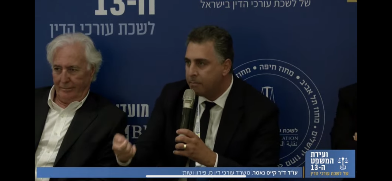 اهلا- المحامي قيس ناصر مشاركة المحامي د. قيس ناصر في مؤتمر القضاء بجلسة عن قانون القومية بدعوة من رئيس نقابة المحامين في البلاد المحامي عميت بيخر شارك المحامي د. قيس ناصر هذا الأسبوع في مؤتمر القضاء الثالث عشر لنقابة المحامين في جلسة خاصة ناقشت قانون القومية. وقد حضر الندوة عشرات المحامين والمحاميات وشخصيات قضائية وأكاديمية رفيعة. أدار الندوة صحفي الشؤون القضائية جلعاد جليكمان من قناة 13، وشارك فيها اعضاء الكنيست كارين الهارار، زئيب ألكين وغلعاد كاريف ومنصور عباس والمحامون تسيون امير ويوسي بنكل، والذين طرحوا مواقفهم المتباينة من قانون القومية. كما سبق افتتاح الندوة كلمة عن الموضوع لفضيلة الشيخ موفق طريف الرئيس الروحي للطائفة الدرزية في البلاد. وقد طرح المحامي د. قيس ناصر، شريك ورئيس قسم التنظيم والبناء في مكتب فيرون، في مداخلته جوانب مختلفة تبيّن عدم شرعية قانون القومية وضرورة إبطاله لتحقيق المساواة الحقيقية والديموقراطية بين كل المواطنين مؤكدا ان "قانون القومية هو خطأ تاريخيّ ودستوري. لم تكن هناك حاجة للقانون سوى رغبة الحكومة حينها في الشقاق والتحريض وإقصاء المواطنين العرب. ليس العمل على تحسين او تجميله القانون بل العمل على أبطاله واستبداله بميثاق يؤكد الحق في المساواة لكل المواطنين". وقد لاقى هذا الموقف تقديرا وقبولا كبيرا من الحضور. (الصور لنقابة المحامين في إسرائيل)