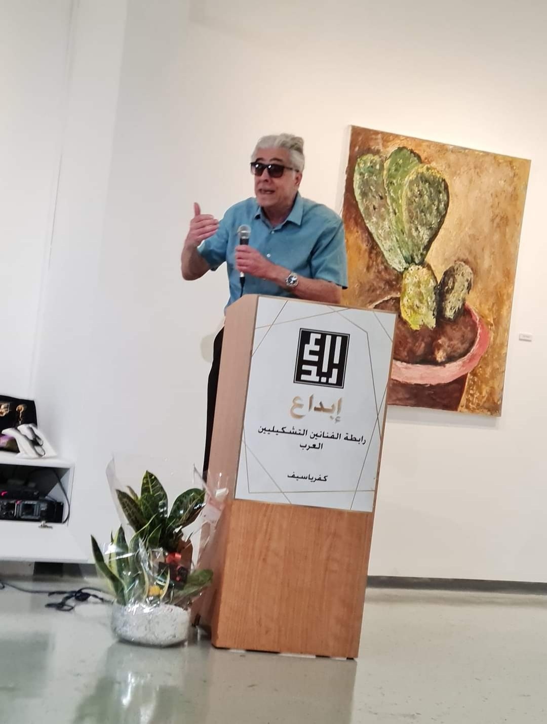 باسمي واسم أعضاء الهيئة الإدارية أرحب بكم أجمل ترحيب لحضوركم افتتاح هذا المعرض الفردي للفنانة الأصيلة ناريمان عمري عضو جمعية ابداع منذ أكثر من عقدين من الزمن , وكانت من أوائل اللذين انتسبوا للجمعية وعضواً فعالاً وناجحاً في جمعية ابداع , ونال مراكز مرموقة وانتخبت كعضوة لجنة المراقبة في الجمعية , وعملت جاهدة لتحسين العلاقات بين الفنانين وإدارة الجمعية مقدمة كل الملاحظات البناءة لرفع المستوى المهني والفني بين الفنانين وتحسين علاقاتهم مع الهيئة الإدارية . وقد كان لي الشرف في زيارتها في بيتها في قرية صندلة منذ السنة الأولى من استلامنا إدارة الجمعية برفقة بعض أعضاء الهيئة الإدارية وذلك للتعرف على البيئة المهنية والفنية .