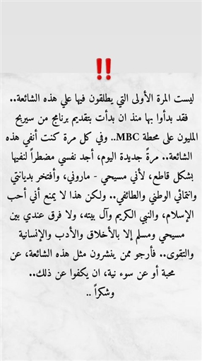 واضاف: “ولكن هذا لا يمنع أني أحب الإسلام، والنبي الكريم وآل بيته، ولا فرق عندي بين مسيحي ومسلم إلا بالأخلاق والأدب والإنسانية والتقوى، فأرجو ممن ينشرون مثل هذه الشائعة عن محبة أو عن سوء نية أن يكفوا عن ذلك وشكرا”.
