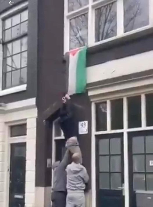 • أحد مشجّعي فريق مكابي تل أبيب يتسلّق واجهة أحد المباني لإنزال علم فلسطين. شو بدّك المحتجّين يعملوا؟ يقولوله شكرًا؟، عفارم عليك؟