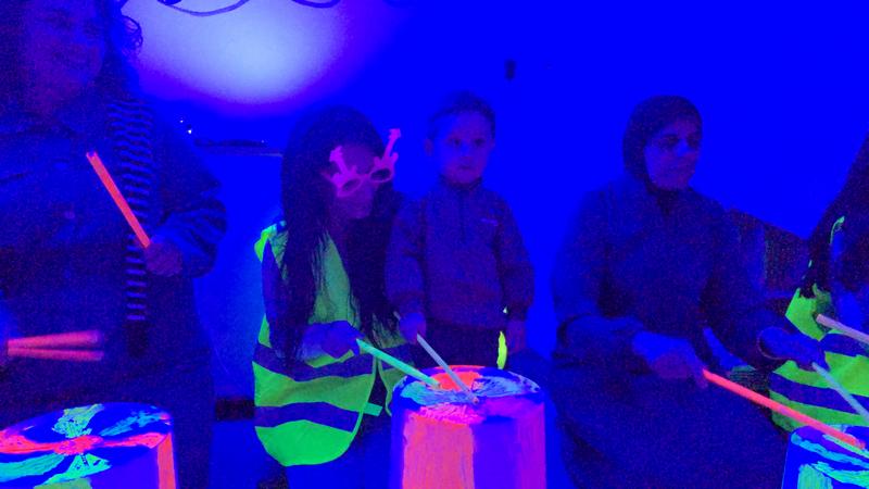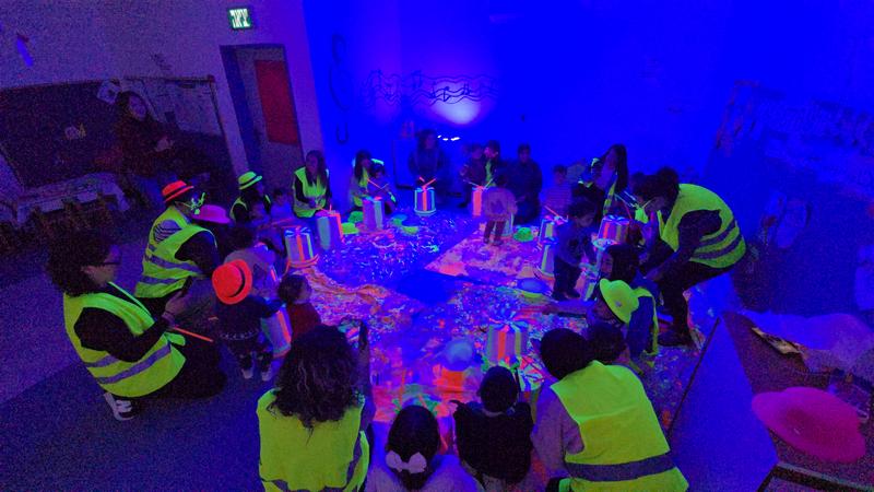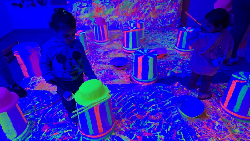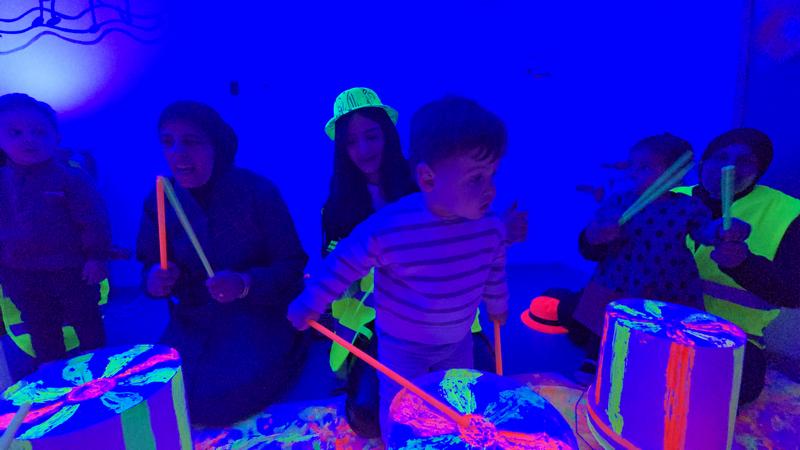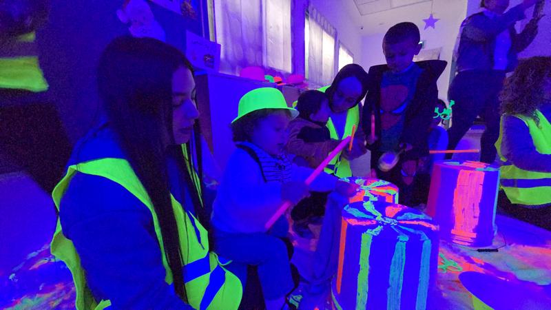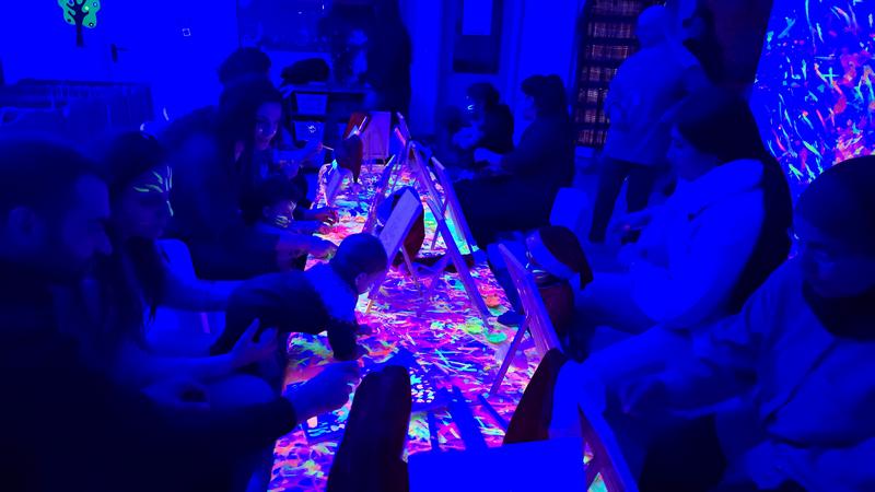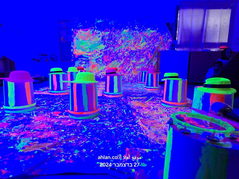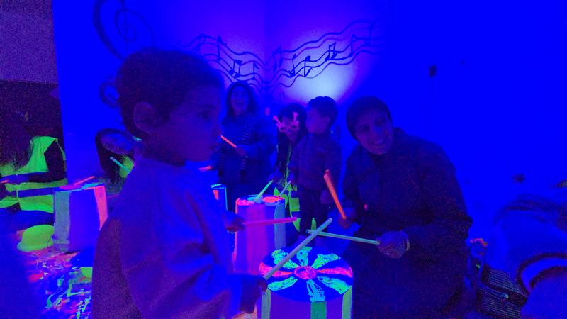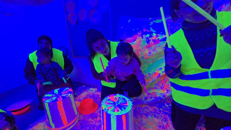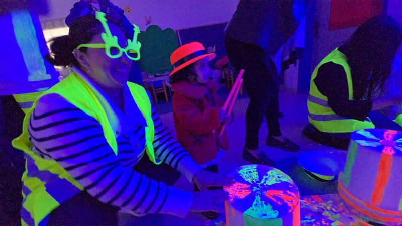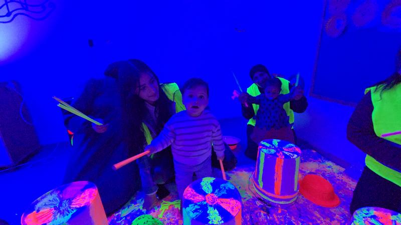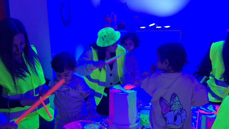 الورشة الاولى اسمها كرنفال الالوان المضيئة فيها شارك غيها الاطفال مع المرافق من الوالدين في دهان مضيء
