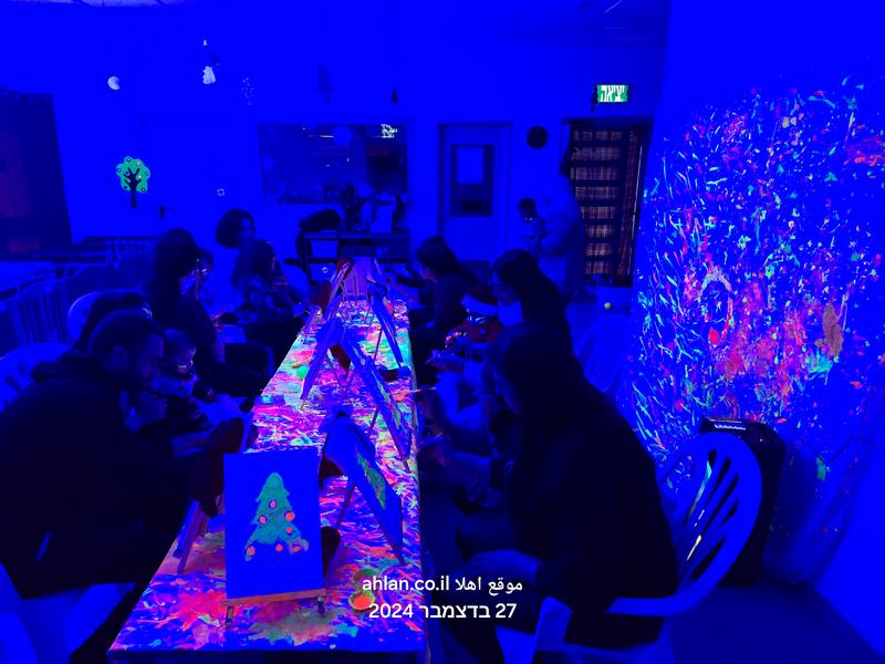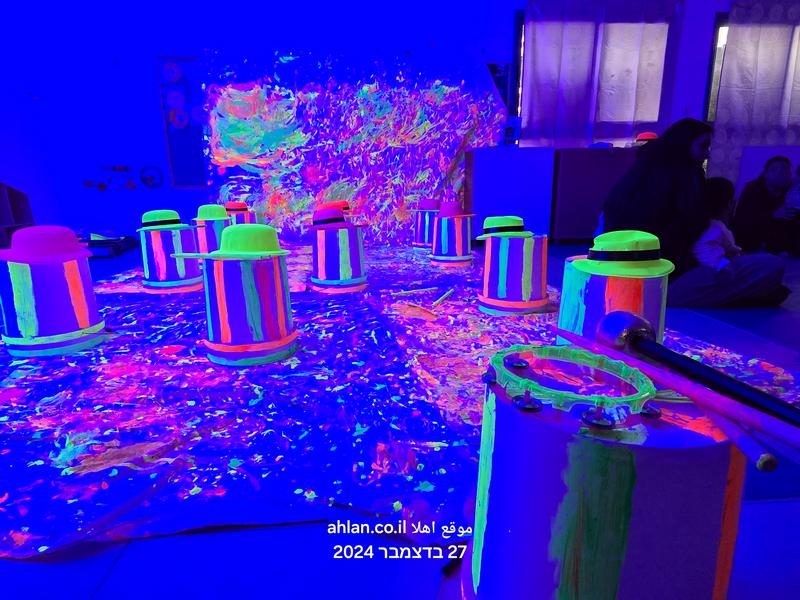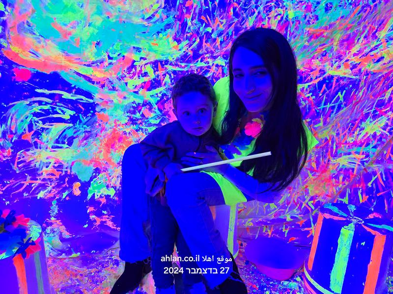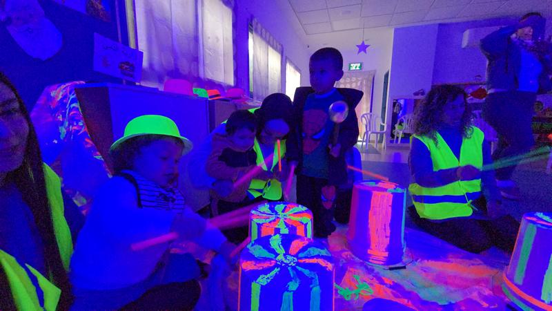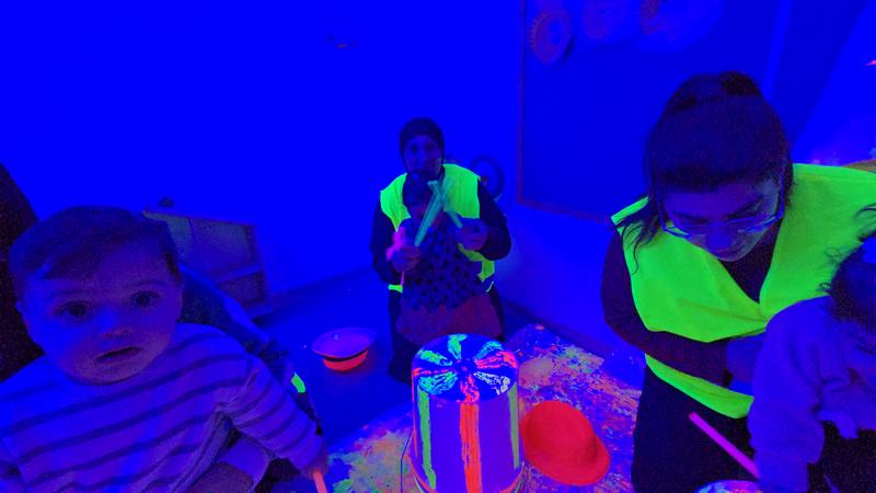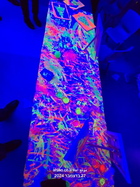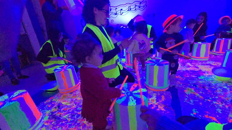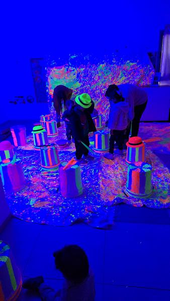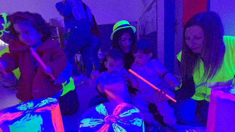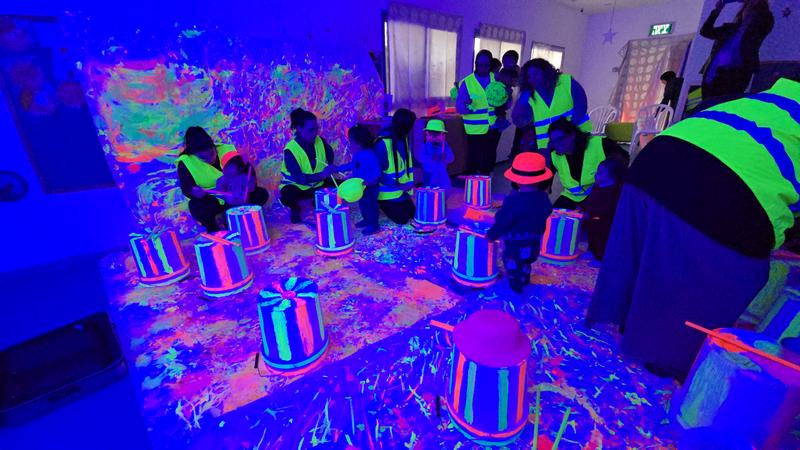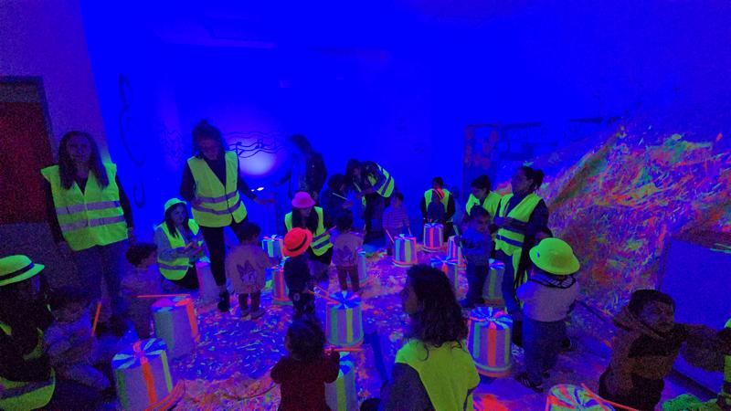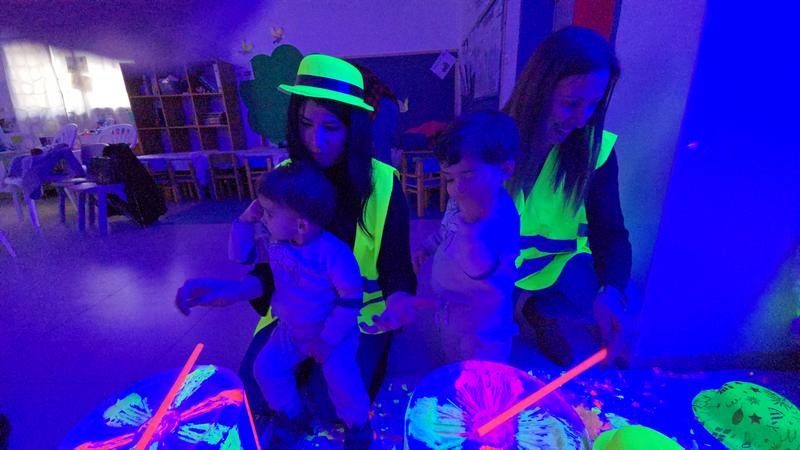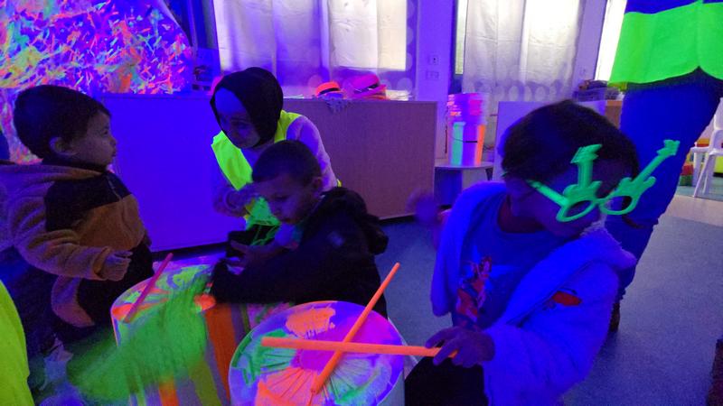 الورشة الاولى اسمها كرنفال الالوان المضيئة فيها شارك غيها الاطفال مع المرافق من الوالدين في دهان مضيء