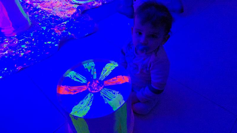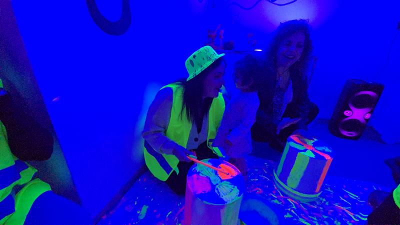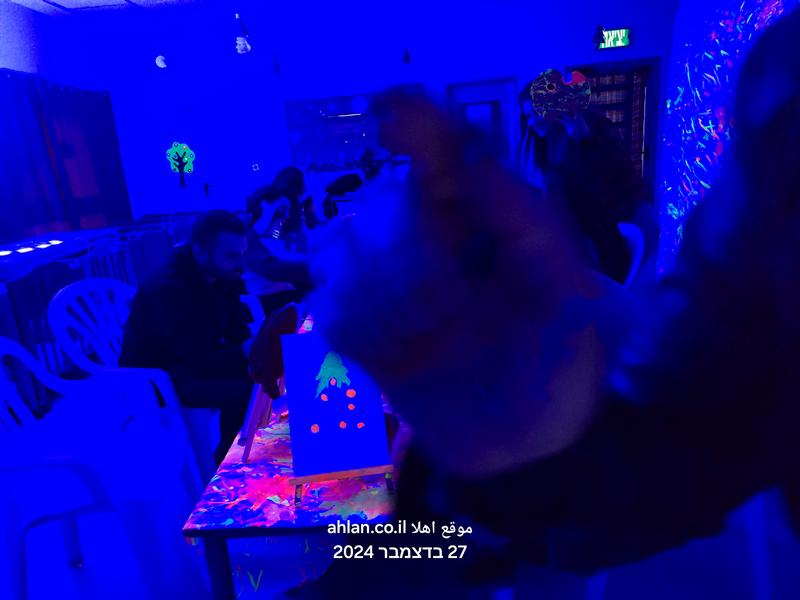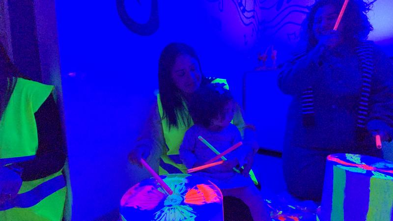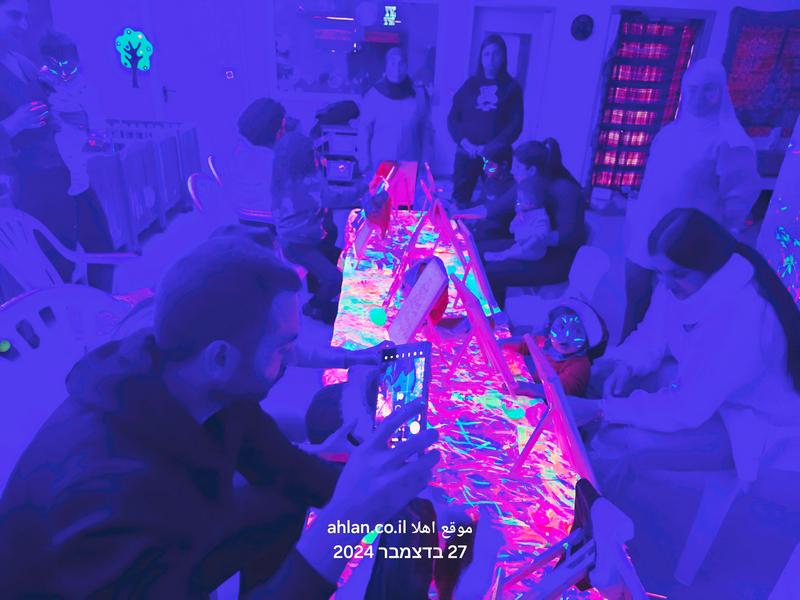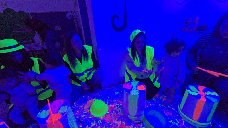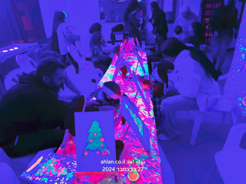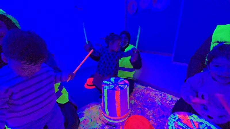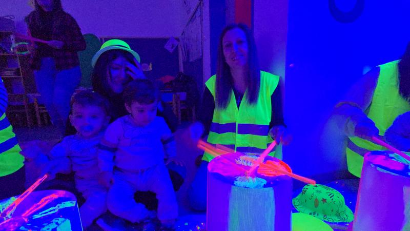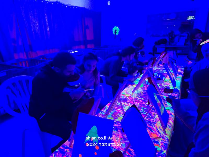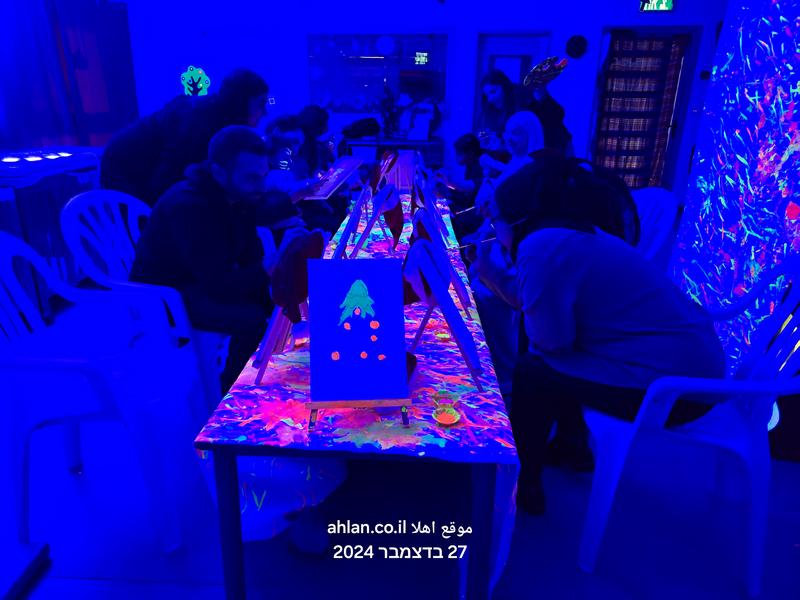 الورشة الاولى اسمها كرنفال الالوان المضيئة فيها شارك غيها الاطفال مع المرافق من الوالدين في دهان مضيء
