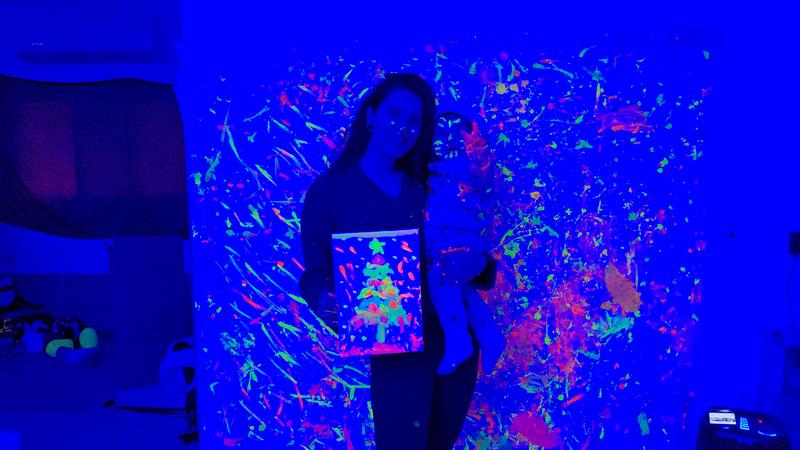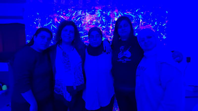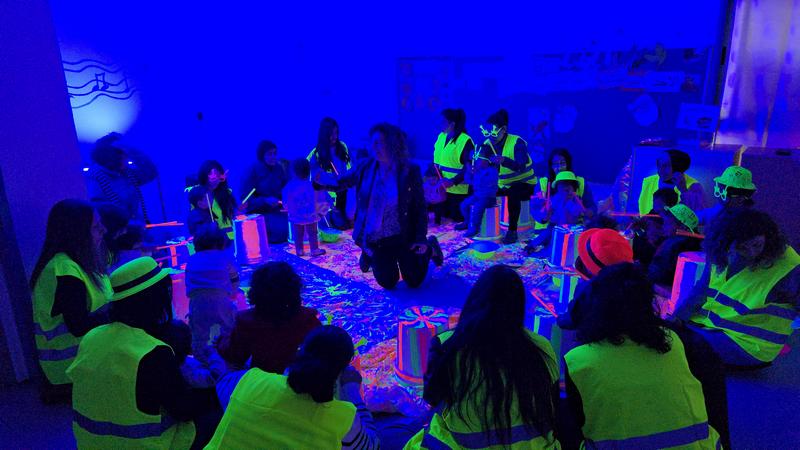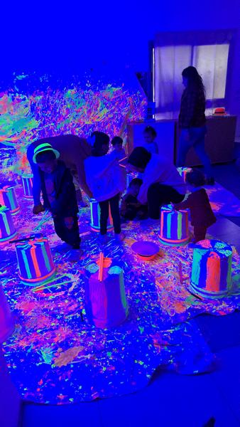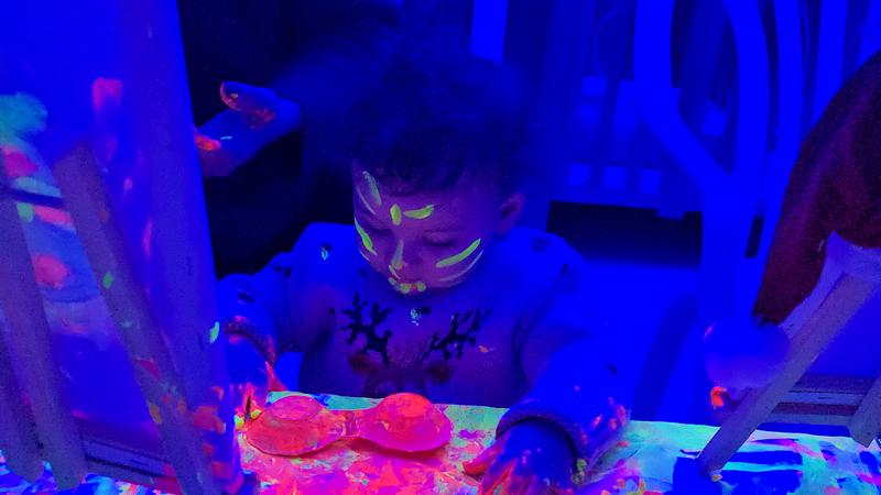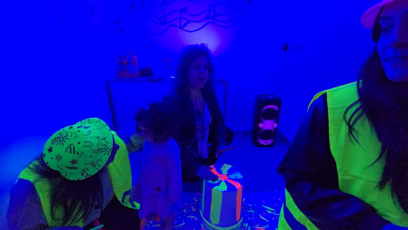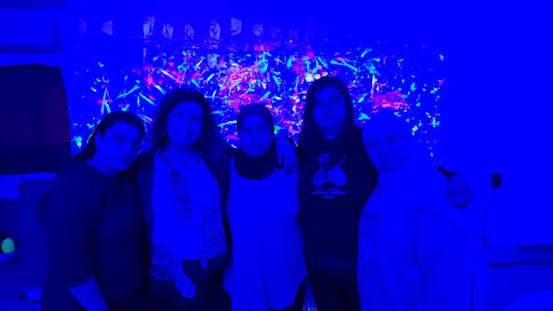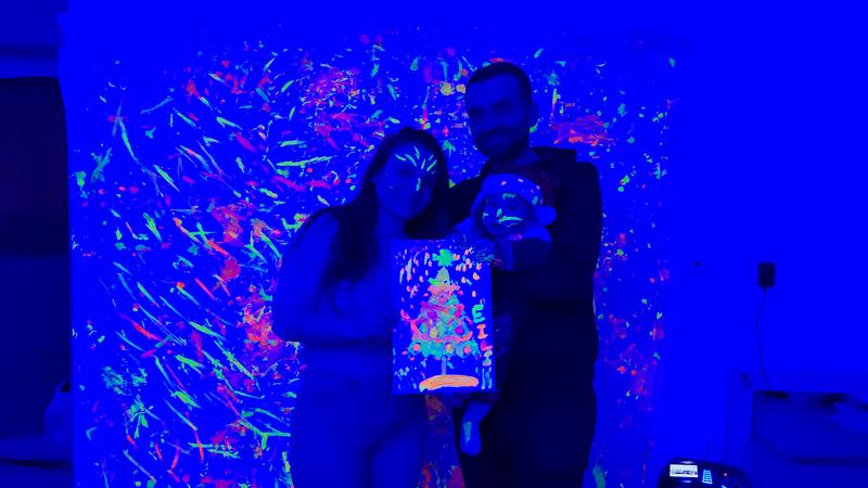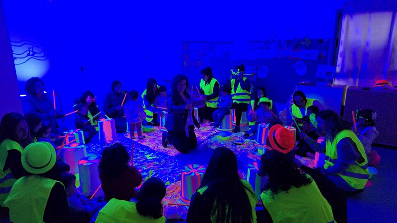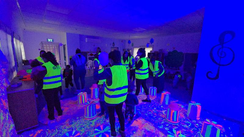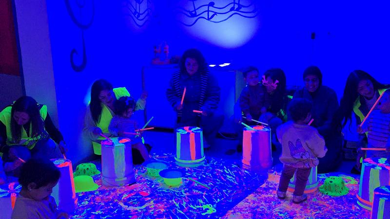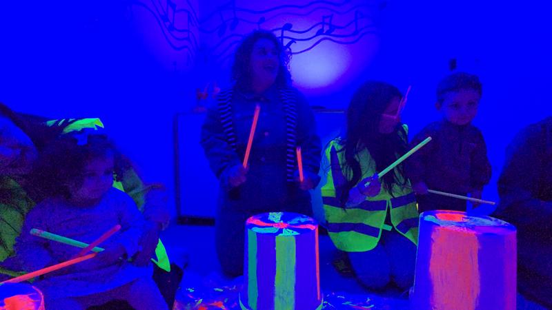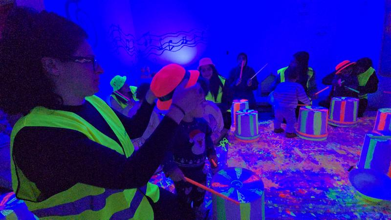 الورشة الاولى اسمها كرنفال الالوان المضيئة فيها شارك غيها الاطفال مع المرافق من الوالدين في دهان مضيء
