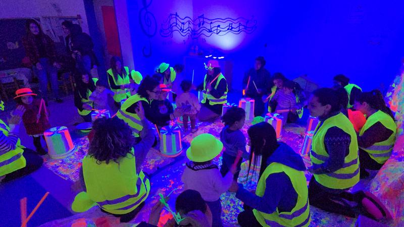 الورشة الثانيه حفلة النجوم في الصف الثاني شارك بها قسم كبير من الاطفال برفقة احد الوالدين شملت التلوين والعزف - حفلة راقصه مضيئة
