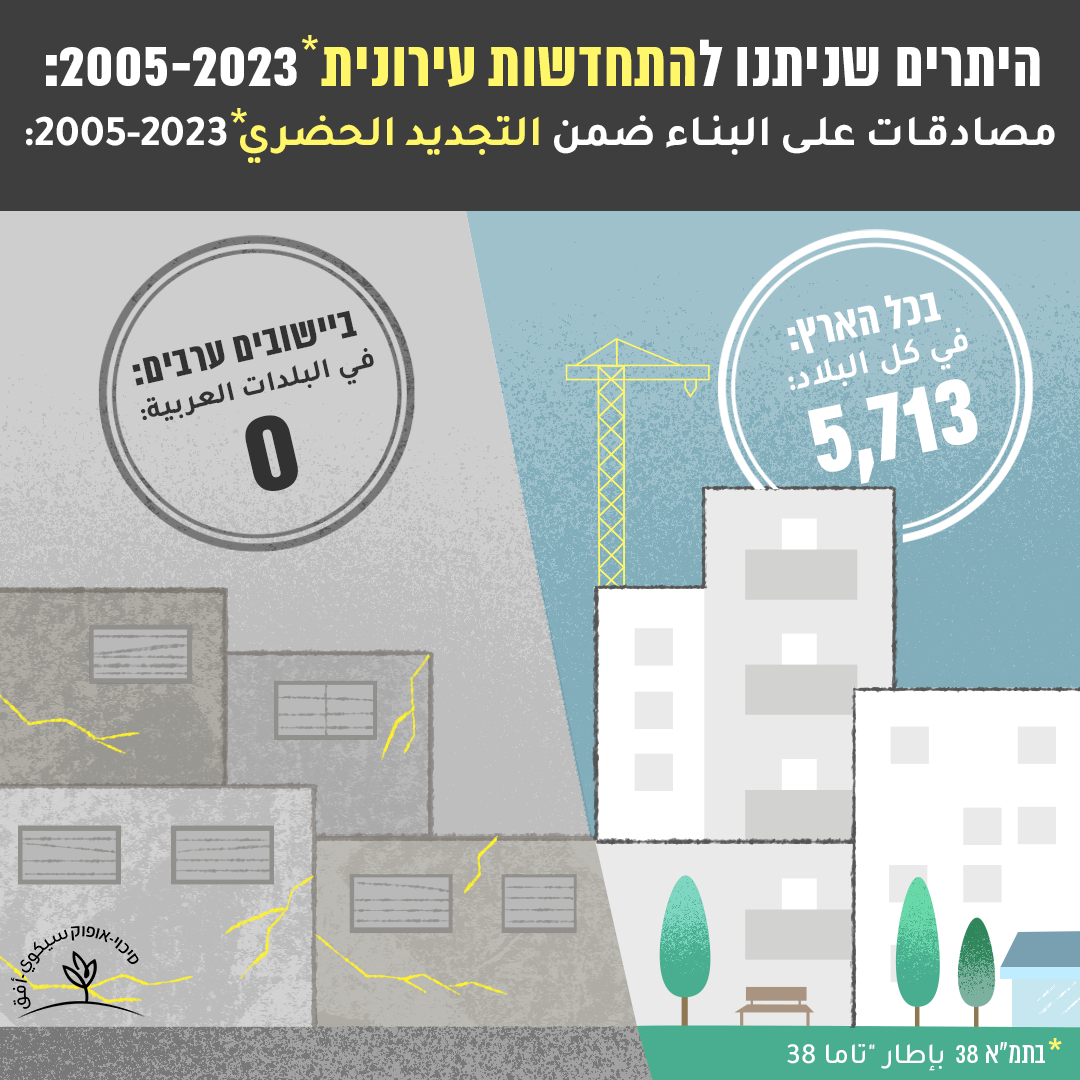 إذ يُشار إلى أن النماذج الحالية للتجديد الحضري - مثل مخطط الإخلاء والبناء ومخطط التعامل مع مخاطر الهزات الأرضية (تاما 38) - غير ملائمة لخصائص واحتياجات المجتمع العربي، لذلك وحتى اليوم، لا يوجد أي مخطط أو مشروع للتجديد الحضري في البلدات العربية بالمقابل هناك أكثر من 5000 مصادقة على البناء ضمن إطار مخططات التجديد الحضري في البلدات اليهودية.