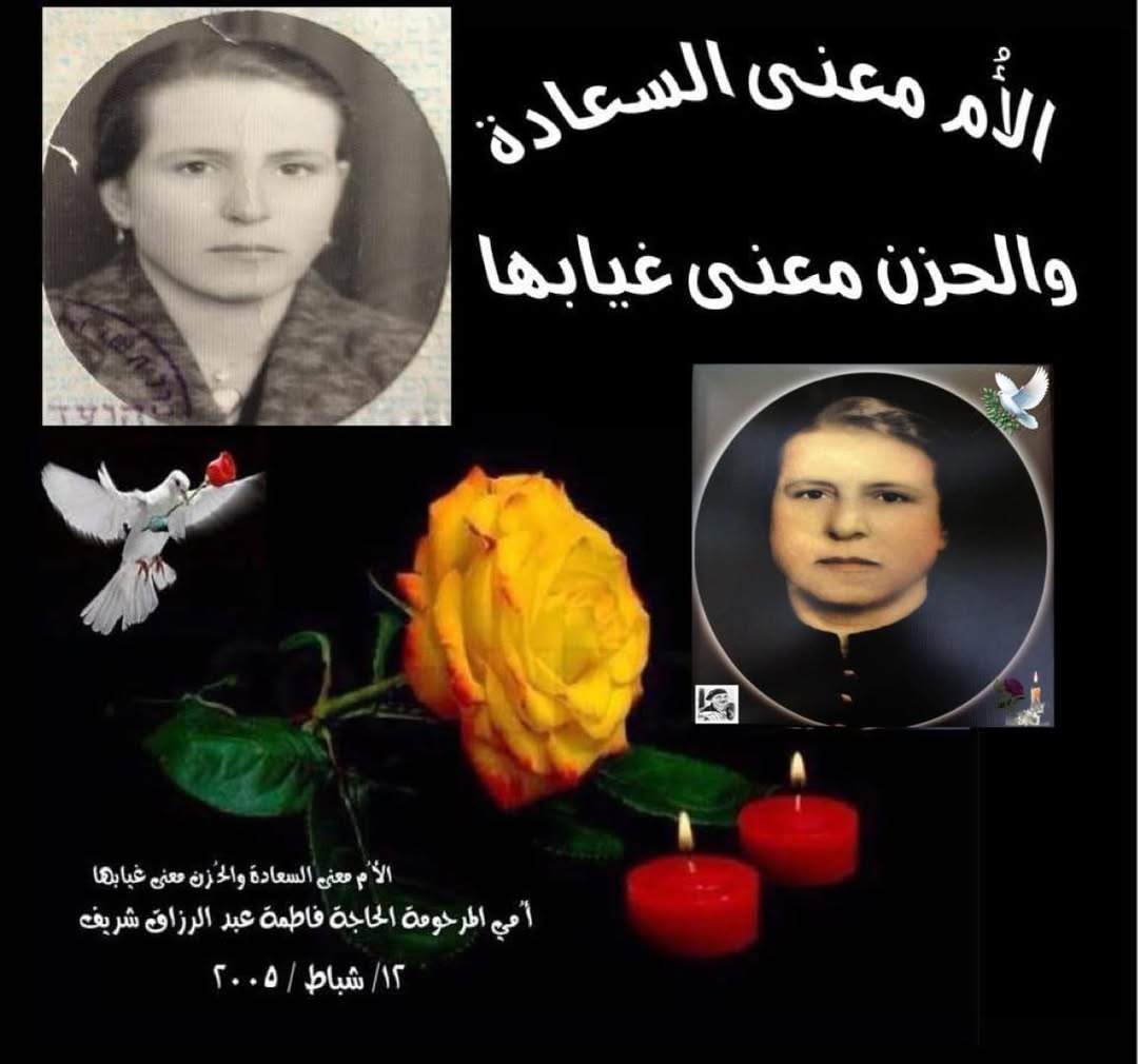 كان لي ولنا ستُ حبايب - امي - يا اعز مخلوق عندي , الى ان اختطفها الموت اللعين وبقي منها الذكريات الاصيله والتربية التي لا تموت ولا يفنيها الزمن مهما مر وطال باقية بشموخها بقاء الزيتون وبقاء الحياة برمتها .