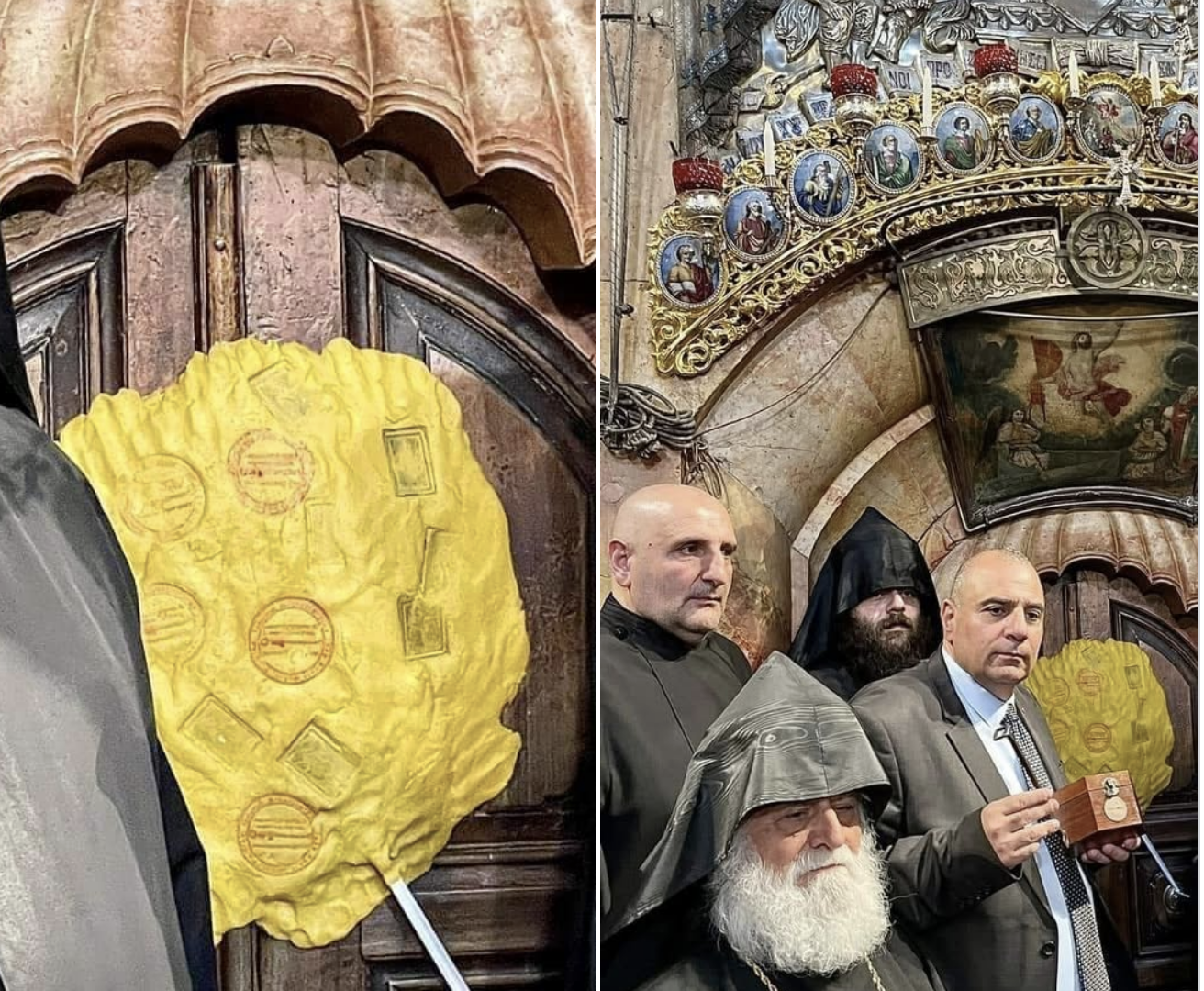 والتفتيش يتم من قبل ثلاثة شهود هم مطران الارمن الأرثوذكس ومطران ارثوذكسي لاغش فيه، وأمين كنيسة القيامة والحامل مفتاحها وهو مسلم سني محترم هو أديب الحسيني يظهر في الصورة مع مطارنة ارمن وكاهن ماروني كما قيل لي .