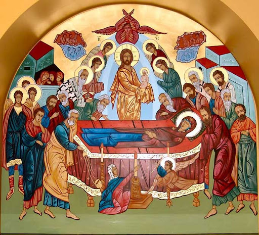 حسب التقليد المقدّس: "جرى دفن والدة الإله في بستان الجثسمانية. هناك أقام الرسل مع الملائكة في الصلاة ثلاثة أيّام. توما الرسول، تدبيًرا، لم يحضر الجنازة. وصل إلى الكنيسة في اليوم الثالث وقد استبدّ به حزن عميق. كان يرغب في أن يلقي نظرة أخيرة على والدة الإله راقدة ليتبرّك منها. ولأجل إصراره قرّر الرسل فتح الضريح ليتسنّى لتوما أن يُكرّم الجسد المقدّس. فلما رفعوا الحجر الذي يسد المدخل استبدّ بهم الدهش لأن الجسد كان قد اختفى. وحده الكفن الذي اشتمل والدة الإله كان هناك وقد اتخذ شكل الجسد. كان هذا دليلاً على انتقال والدة الإله إلى السماء".