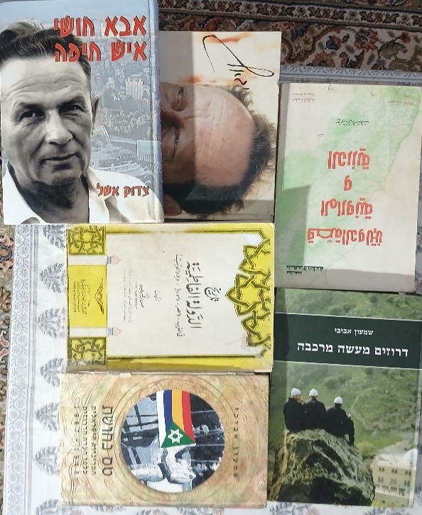 -هذا ما لقّنوكم إياه عمداً ومع سبق الإصرار، وأنا استغرب من مثقّفين مثلكم (أهل الكتاب) اجترار هذه الثّقافة المُشوّهة، هاكُم مجموعة من الكتب والمراجع بالعربيّة والعبريّة، لعلّها تُزيل الغشاوة عن عيونكم، ديكوباجُ كُتُب مُشَقْلَبٌ كأوضاع جبل العرب حاليّاً، من اليمين إلى اليسار ومن الأعلى إلى الأسفل: