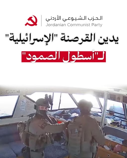 إنّ حزبنا، الحزب الشيوعي الاردني، إذ يعرب عن تقديره العالي لجرأة المتضامنين الأمميين البواسل، يرى في تنامي حركة التضامن الأممي مع القضية الفلسطينية والانتصار لعدالتها اليقينية، مؤشرا واضحا لتصاعد مد جماهيري عالمي للتصدي للامبريالية العالمية، وخصوصا الأمريكية، ولعدوانيتها المتصاعدة ضد شعوب العالم أجمع، وفي مقدمتها الشعب الفلسطيني، ويدين بشدة تمادي الاحتلال "الإسرائيلي" في جرائمه البشعة، وانتهاكاته الفظة للعهود والشرعة الدوليه لحقوق الشعوب والانسان، واستهتاره اللإانساني بحياة الناس، ويطالب بعدم تعريض المتضامنين لأي أذى وإطلاق سراحهم فورا وتأمين عودتهم سالمين إلى أوطانهم وعائلاتهم.