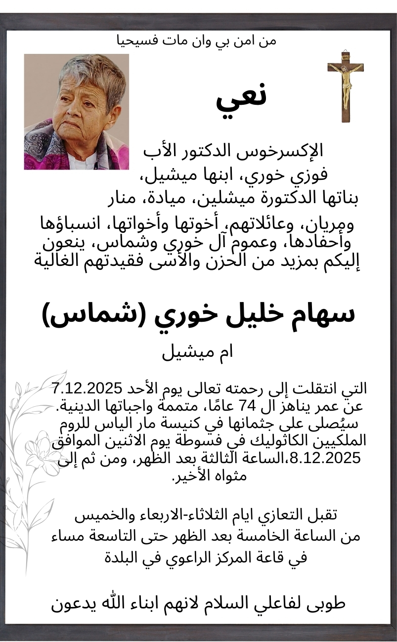 فسوطة : وفاة الفاضلة سهام خليل خوري ام مشيل