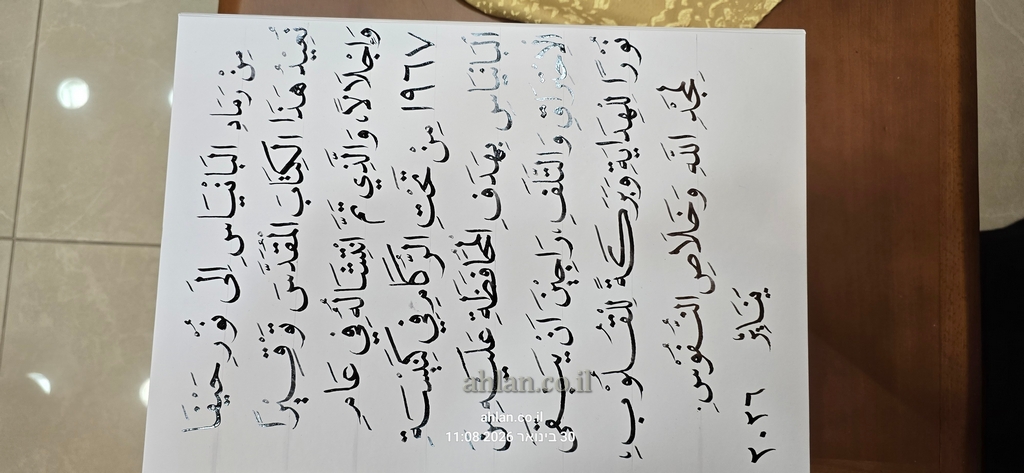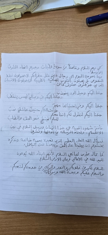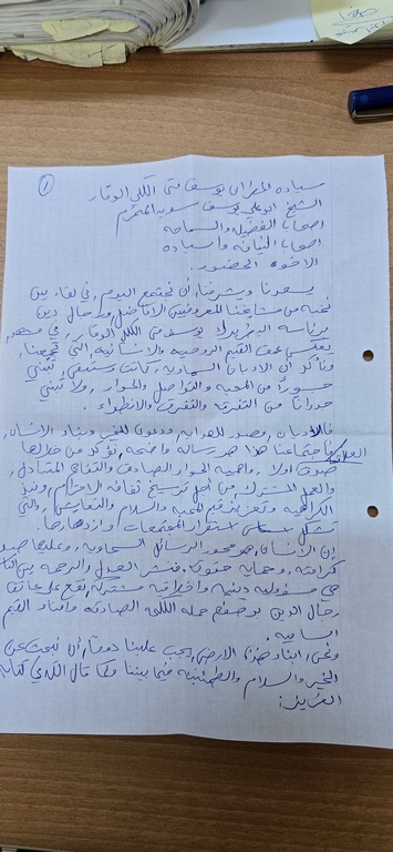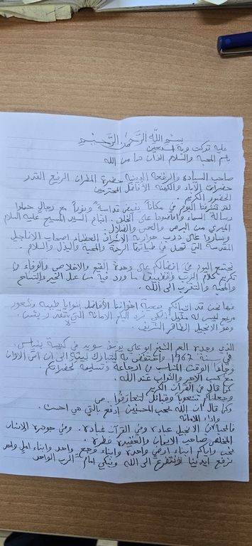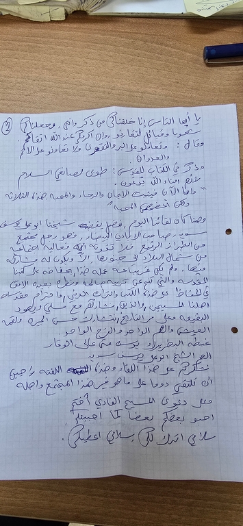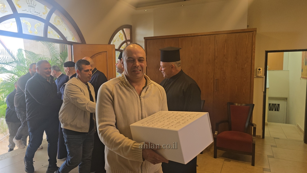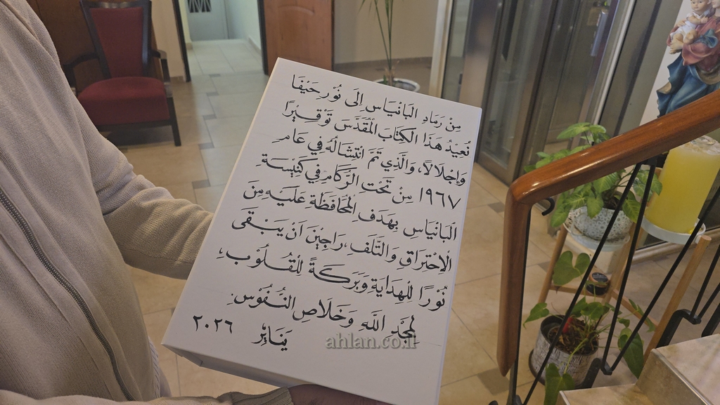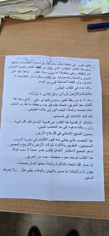 ومضى يقول: إنه بعد التشاور مع فضيلة الشيخ موفق طريف وعدد من المشايخ تقرر تسليمها إلى سيادة المطران يوسف متى، بصفته المسؤول الديني عن الكنيسة ومقدساتها، وهكذا جئناكم لتسليم هذه الأمانة. وورد على غلاف العلبة التي حفظت الكتب فيها: "من رماد البانياس إلى نور حيفا نعيد هذا الكتب المقدسة توقيرا وإجلالا، والذي تم انتشالها في عام 1967 من تحت الركام في كنيسة بانياس، بهدف المحافظة عليها من الاحتراق والتلف، راجين أن تبقى نورًا للهداية وبركة للقلوب، لمجد الله وخلاص النفوس. يناير 2026.